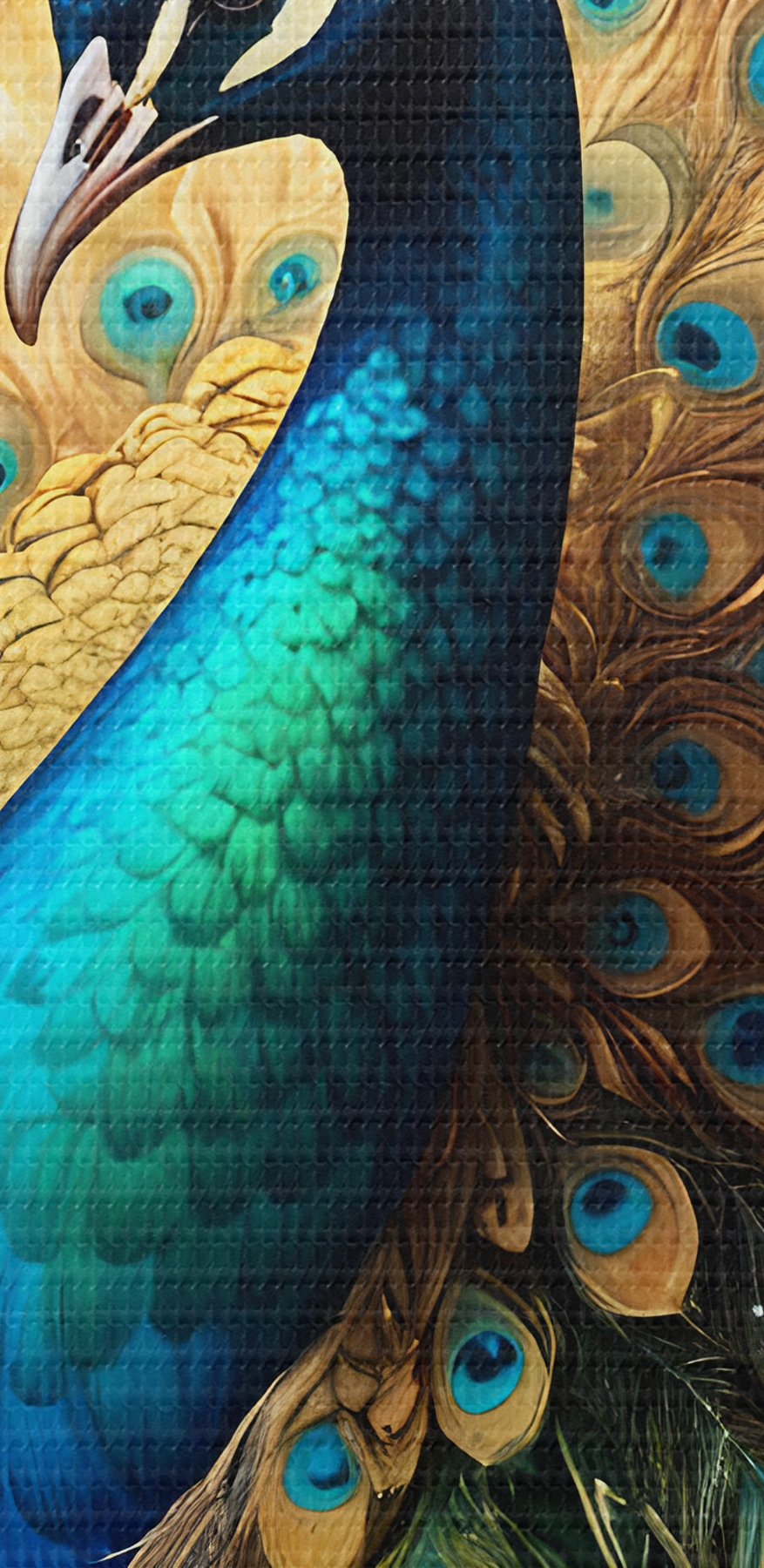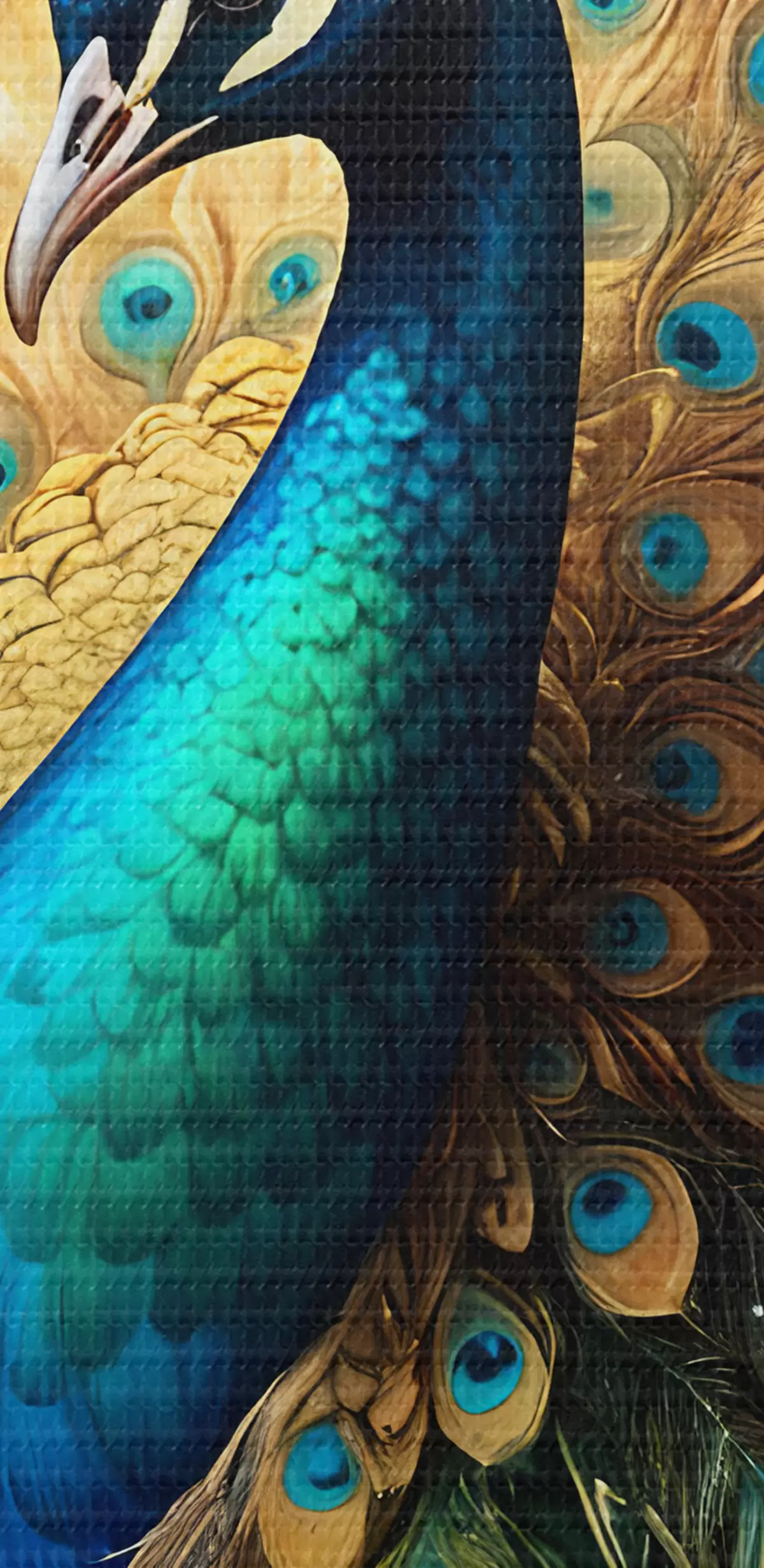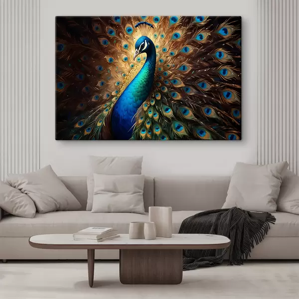 Paveikslas Ryškus povas, kurio plunksnos yra visiškai iškabintos, demonstruojantis nuostabią mėlyną, žalią plunksną Nr s40571