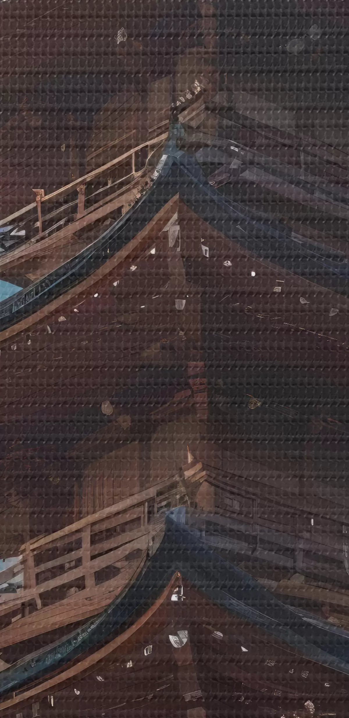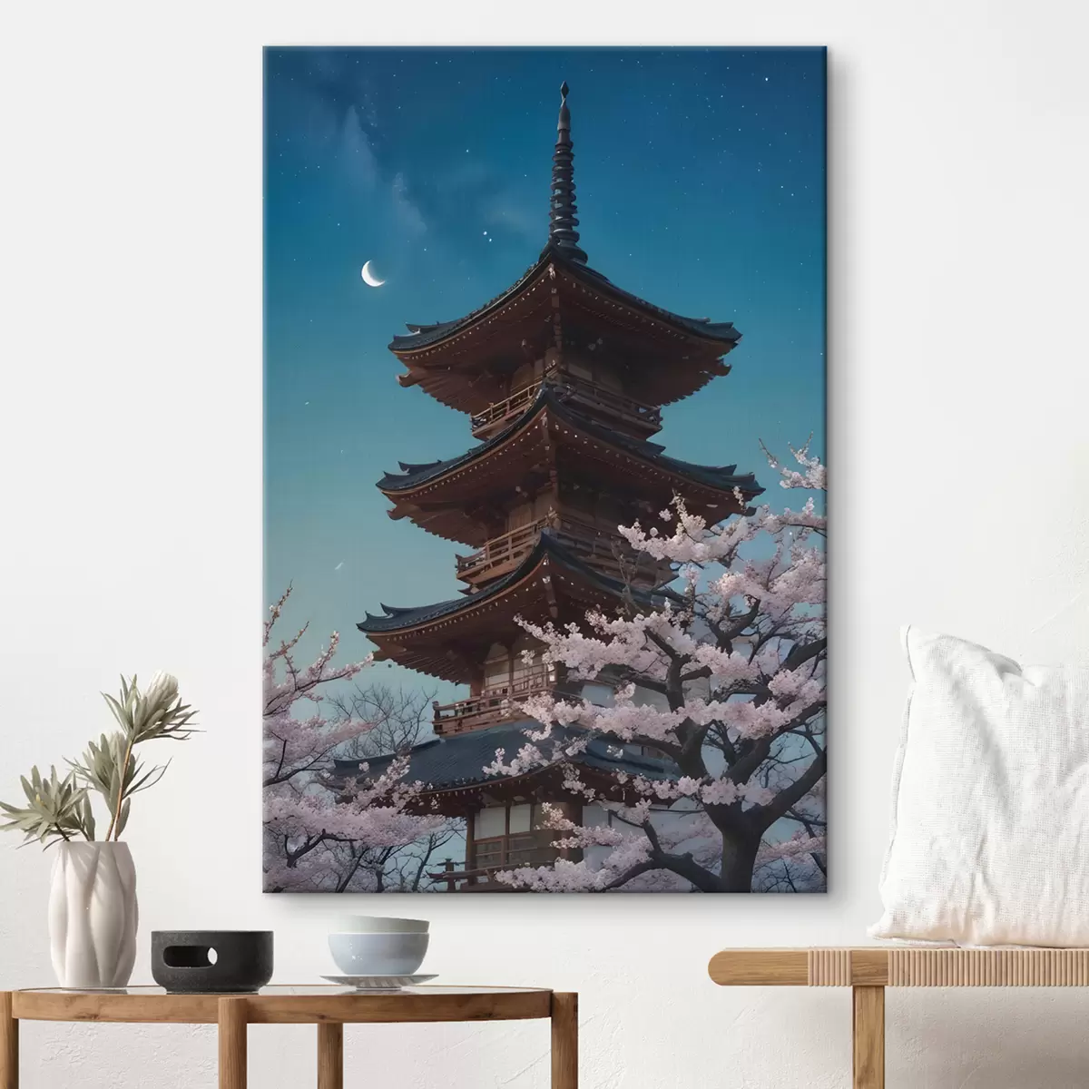 Paveikslas Tradicinė japonų pagoda su pusmėnuliu danguje ir žydinčiomis vyšniomis Nr s40586