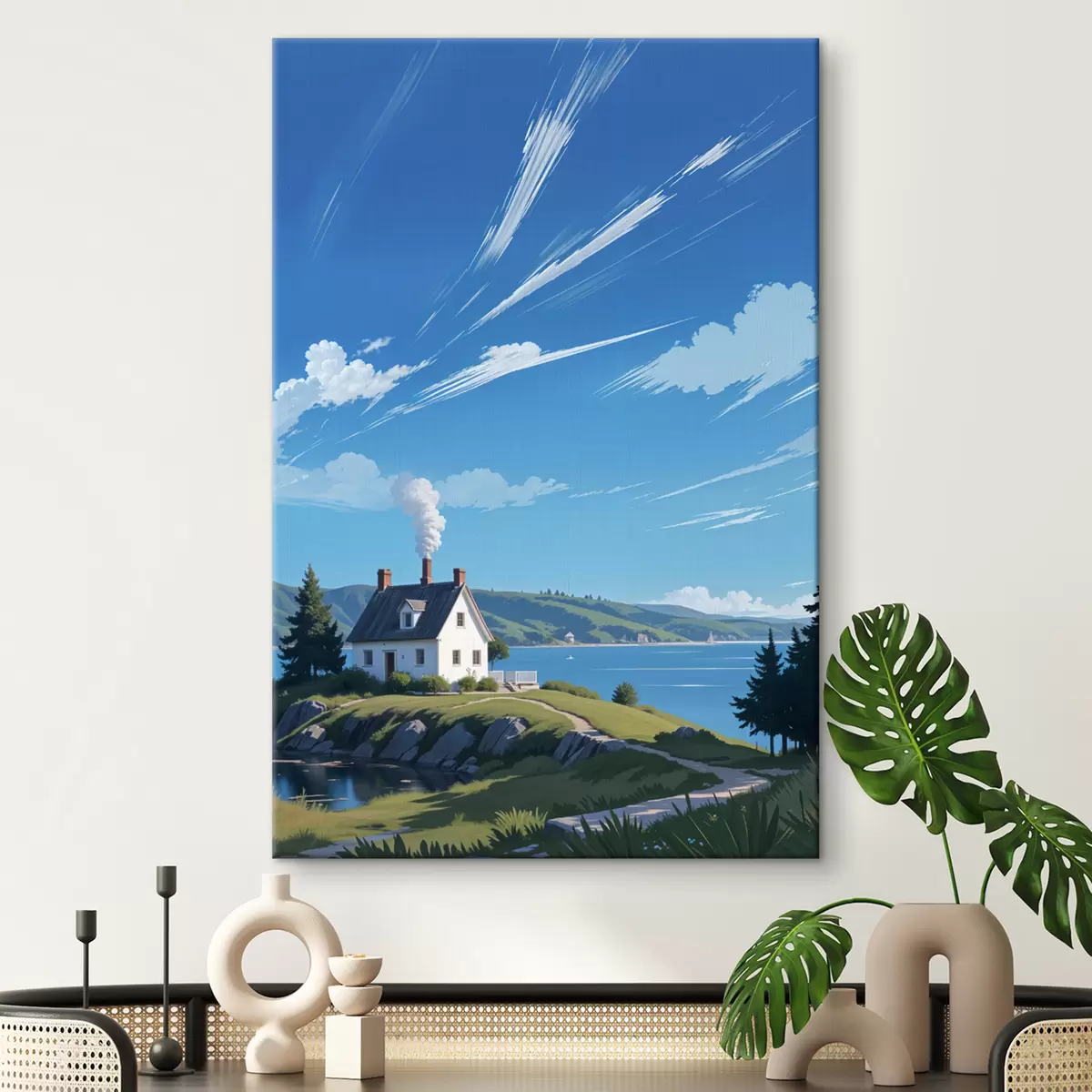 Paveikslas Baltas namas ant žole apaugusios kalvos su kalnais fone ir mėlynu dangumi su debesimis Nr s40587