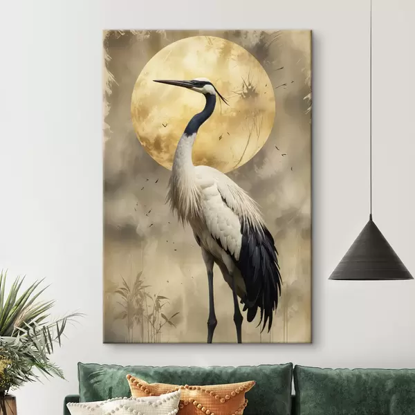 Paveikslas Didinga pilka gervė stovi priešais didelę mėnulio pilnatį, fonas neryškus, natūralus Nr s40591
