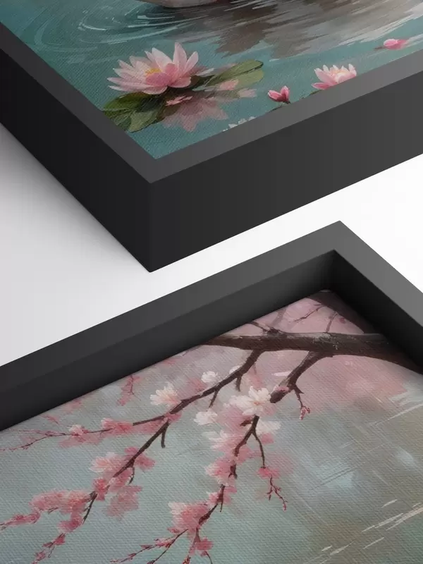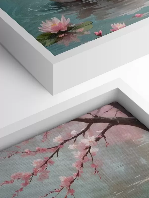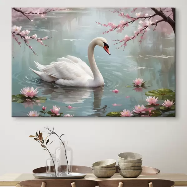 Paveikslas Grakšti balta gulbė, plaukiojanti ramiame tvenkinyje, apsuptame žydinčių rausvų vyšnių medžių Nr s40597