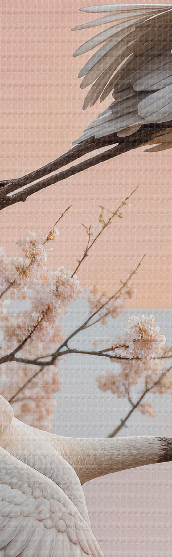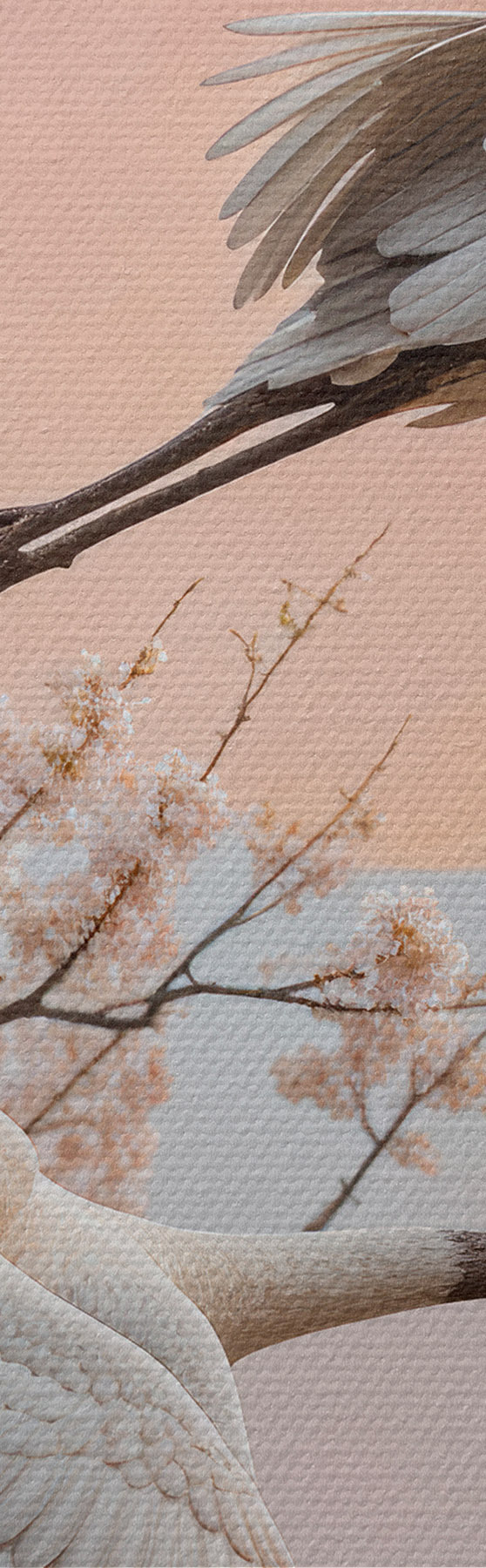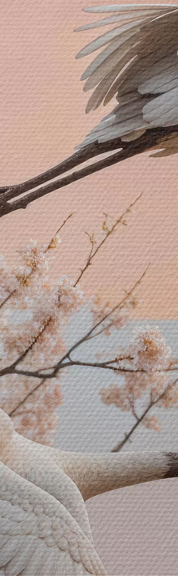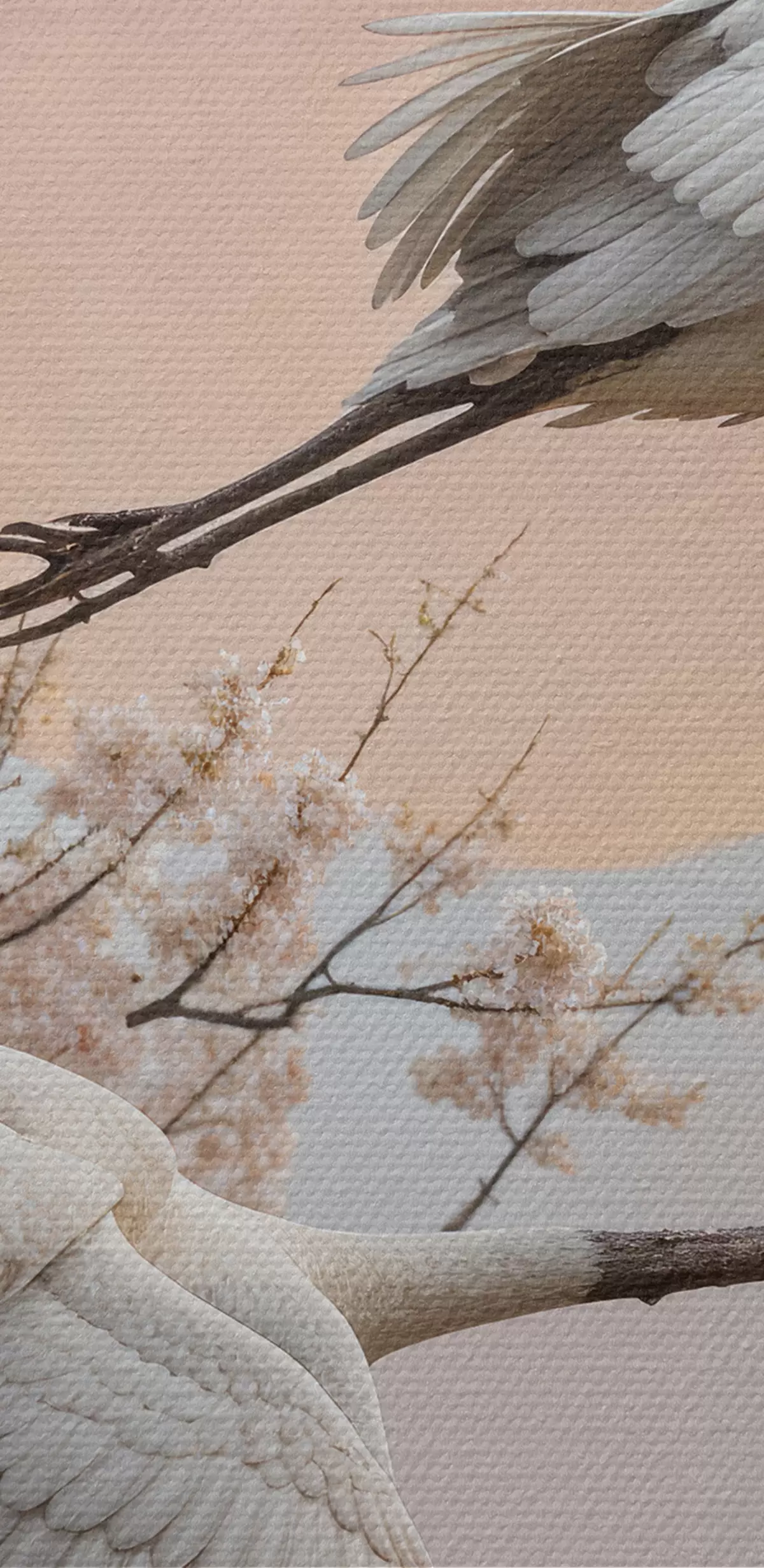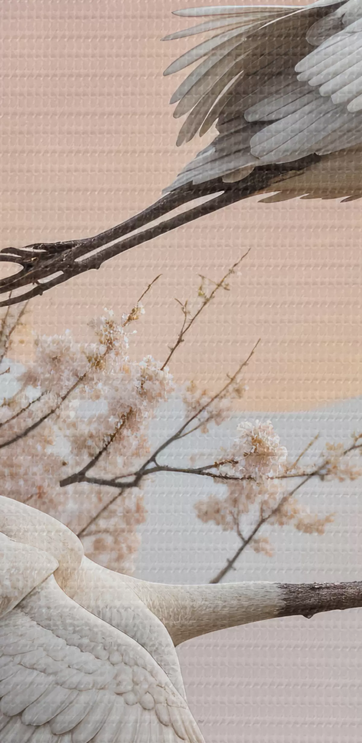 Paveikslas Dvi baltos gervės, skrendančios tarp žydinčių vyšnių medžių rausvame saulėlydžio danguje Nr s40601