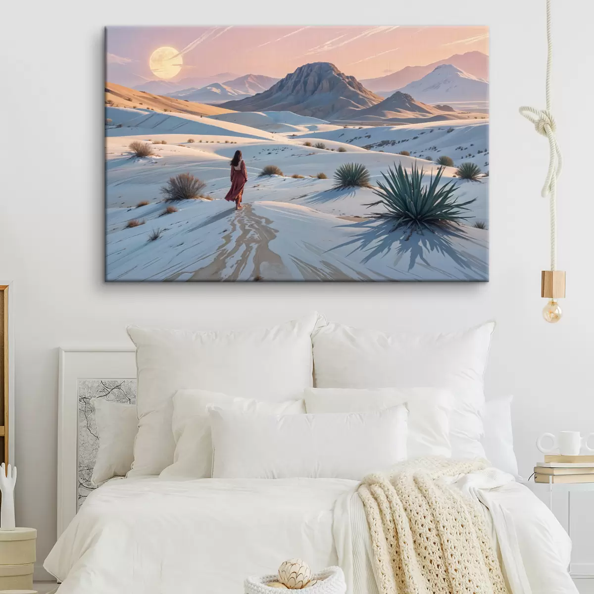 Paveikslas Raudona suknele vilkinti moteris dykumos kraštovaizdyje su kalnu fone ir smėlio kopomis Nr s40603