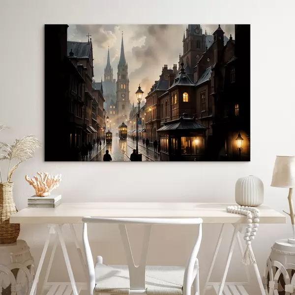 Paveikslas Lietingas vakaras sename Europos mieste su grindinio gatvėmis, istoriniais pastatais ir pravažiuojančiu tramvajumi Nr s40604