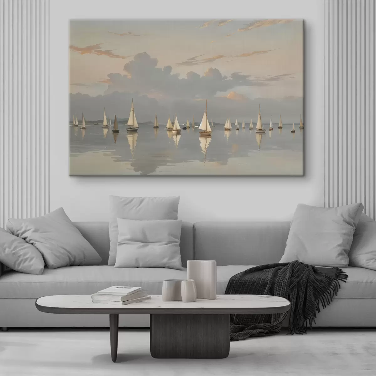 Paveikslas Baltų burlaivių flotilė ramioje, atspindinčioje saulėlydį vandens telkinyje, o fone - debesuotas dangus Nr s40615