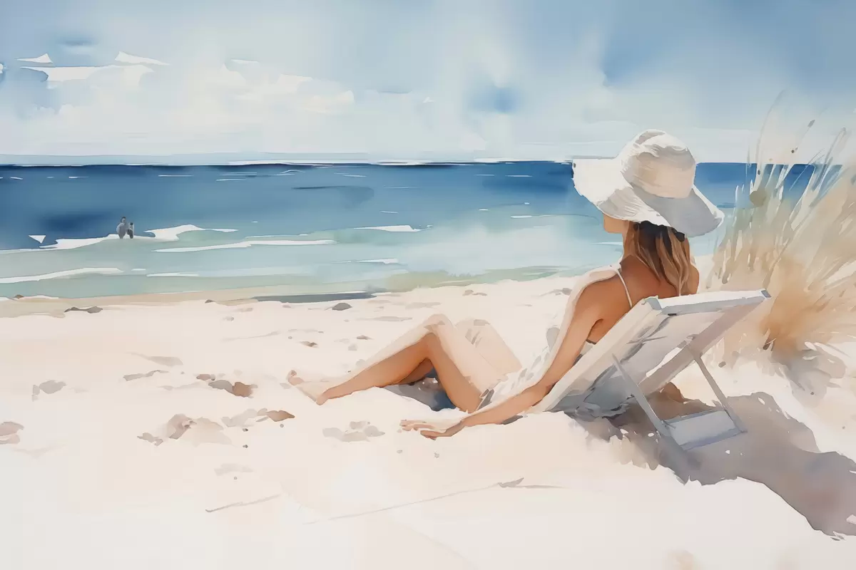 Paveikslas Mergina atsipalaidavusi paplūdimyje prie jūros akvarelė Nr s40679