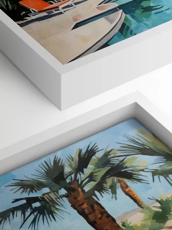 Paveikslas Palmės šalia viešbučio su baseinu prie uolų, mėlyna, žalia, raudona spalva Nr s40748