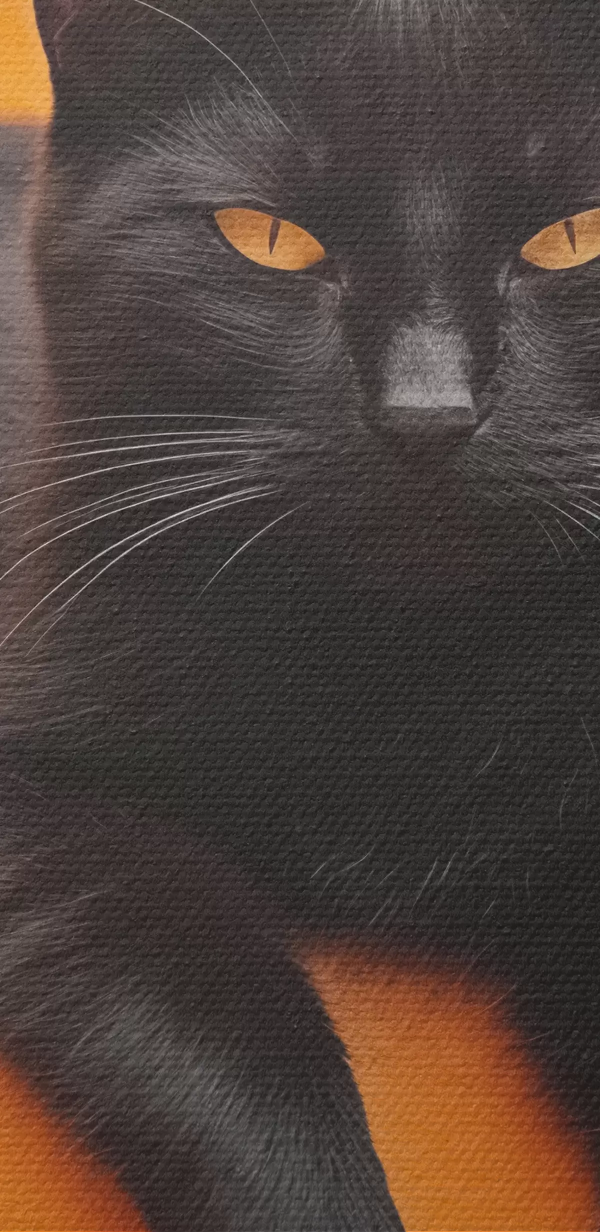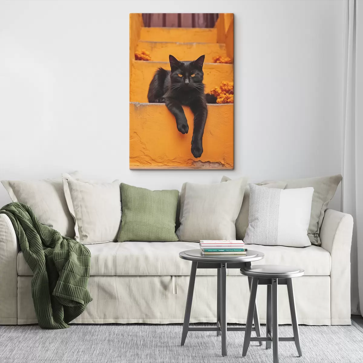 Paveikslas Juodas katinas guli ant geltonų laiptų Nr s40798