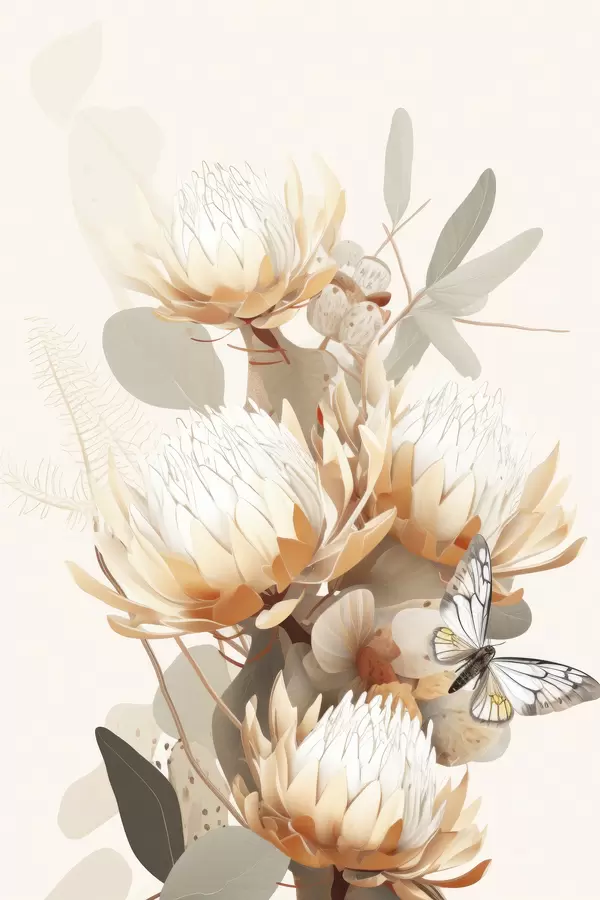 Paveikslas Gražios protea gėlės su drugeliu, švelnios smėlio spalvos, medvilnė Nr s40816