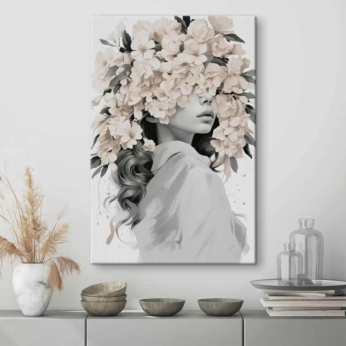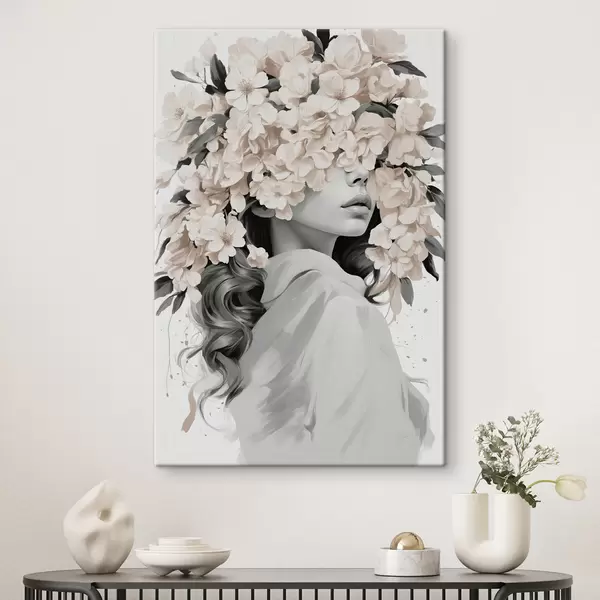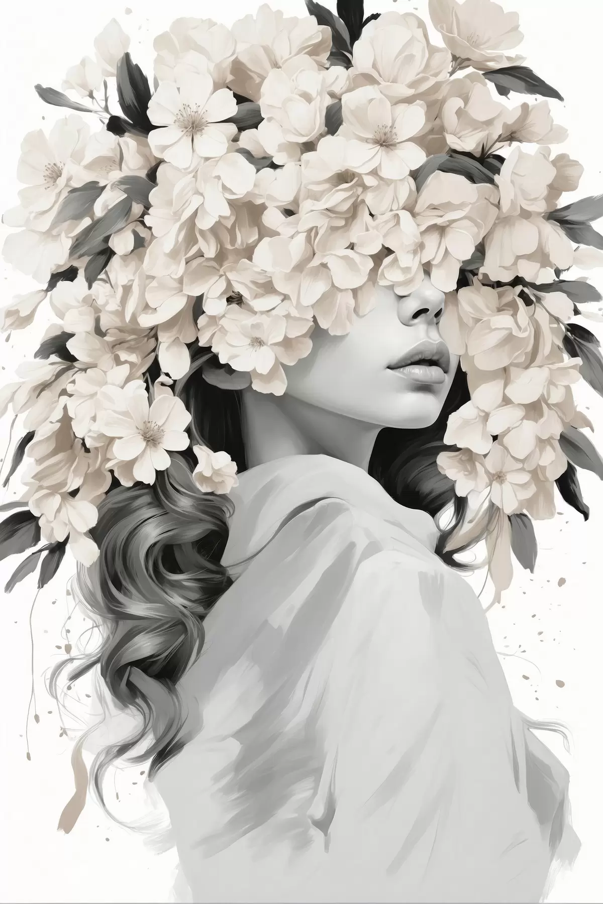 Paveikslas Mergaitė su gėlėmis ant veido juodos ir baltos spalvų Nr s40849