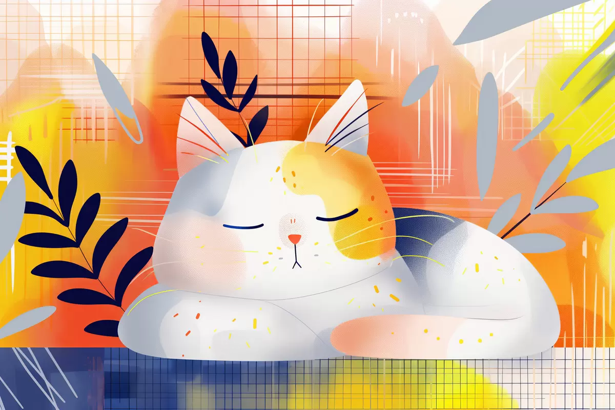 Paveikslas Grafinio stiliaus mielas katinas, miegantis tarp augalų Nr s40956