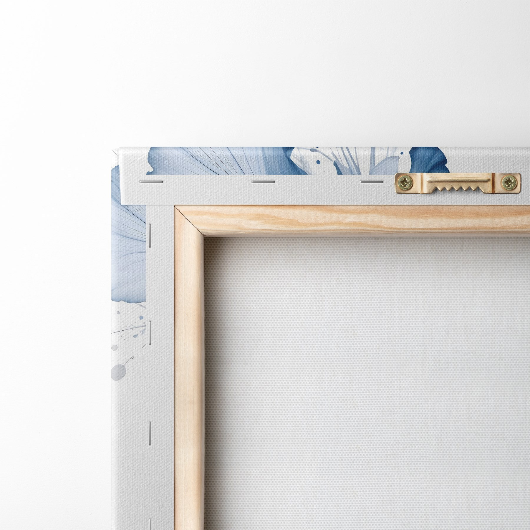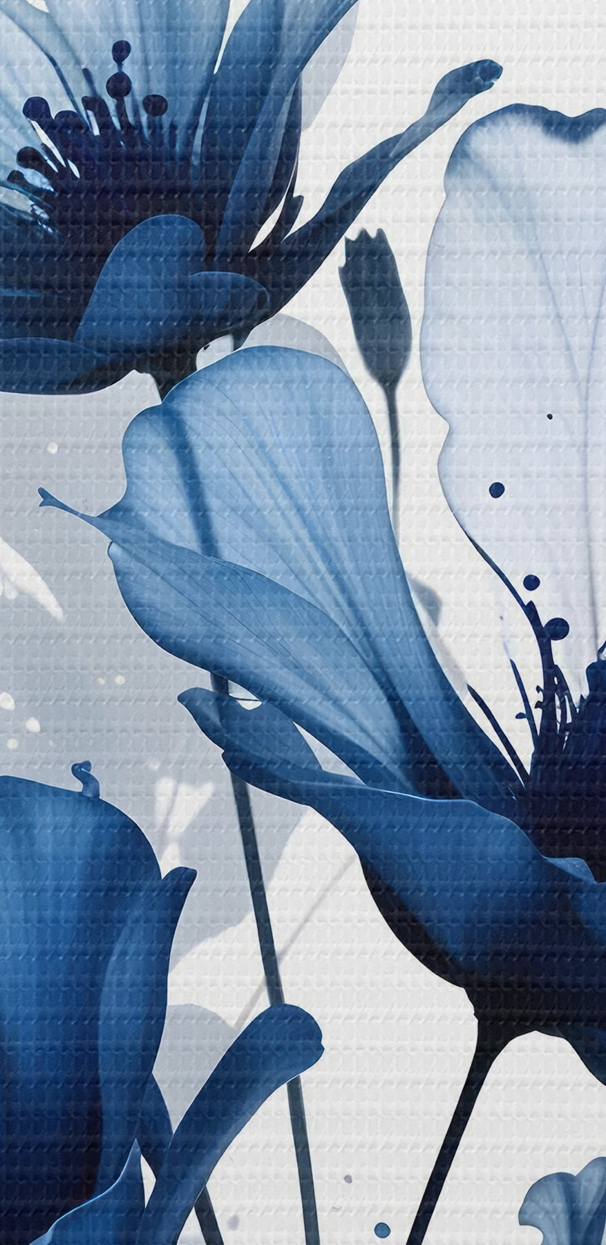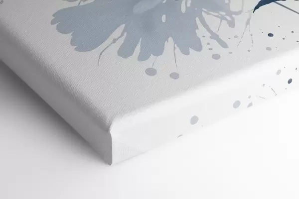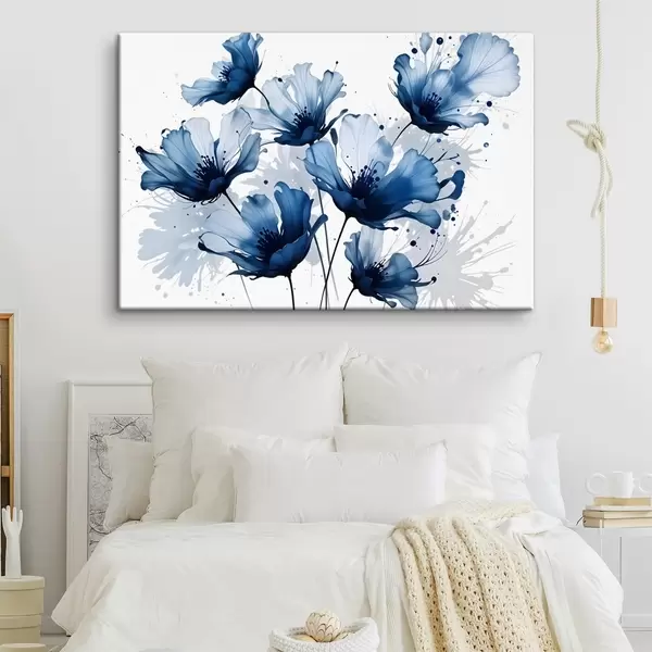 Paveikslas Abstrakčios didelės mėlynos ir baltos spalvos gėlės su švelniais, purslais neryškiais žiedlapiais baltame fone Nr s41082