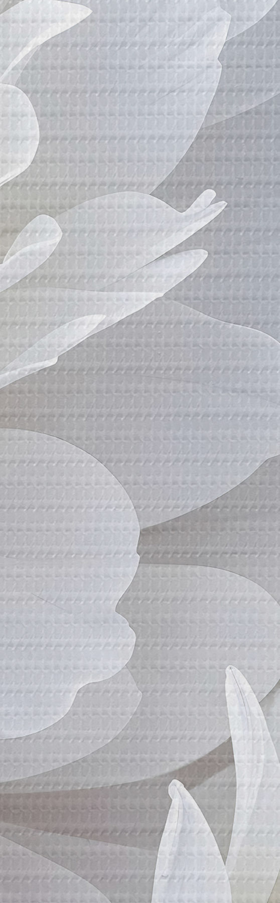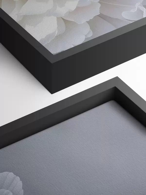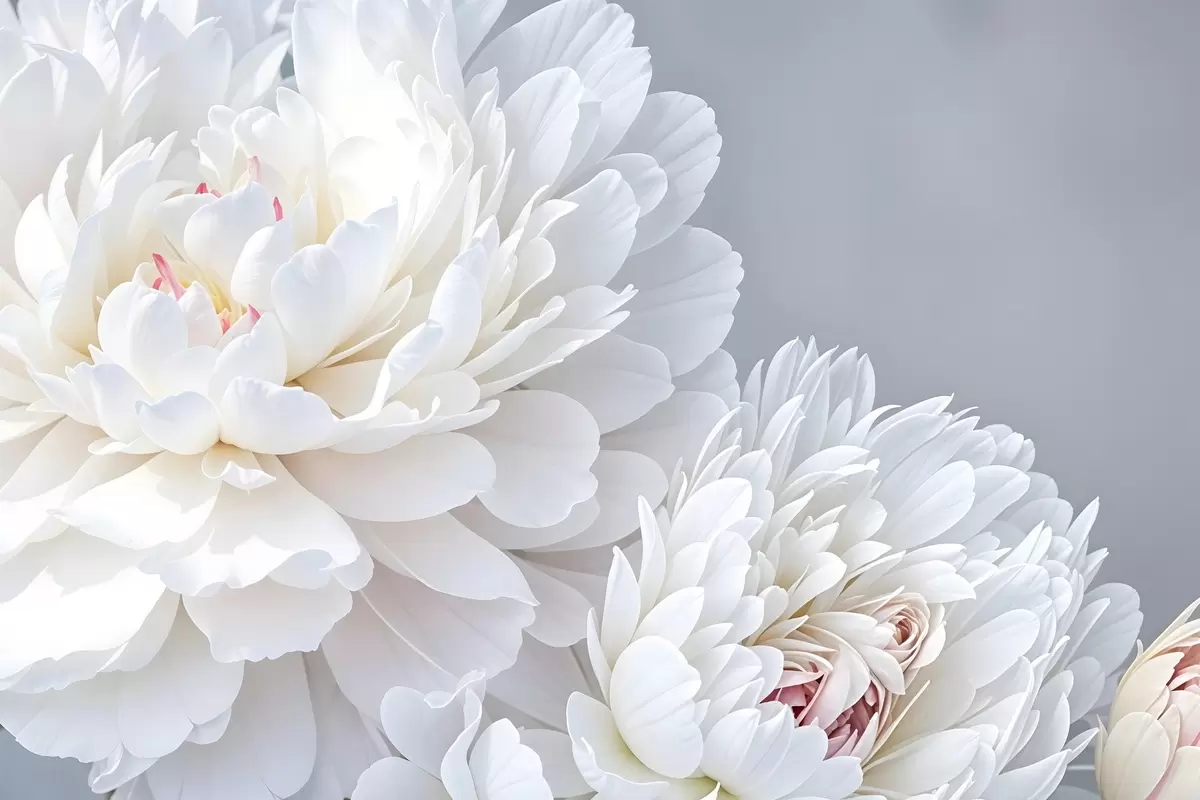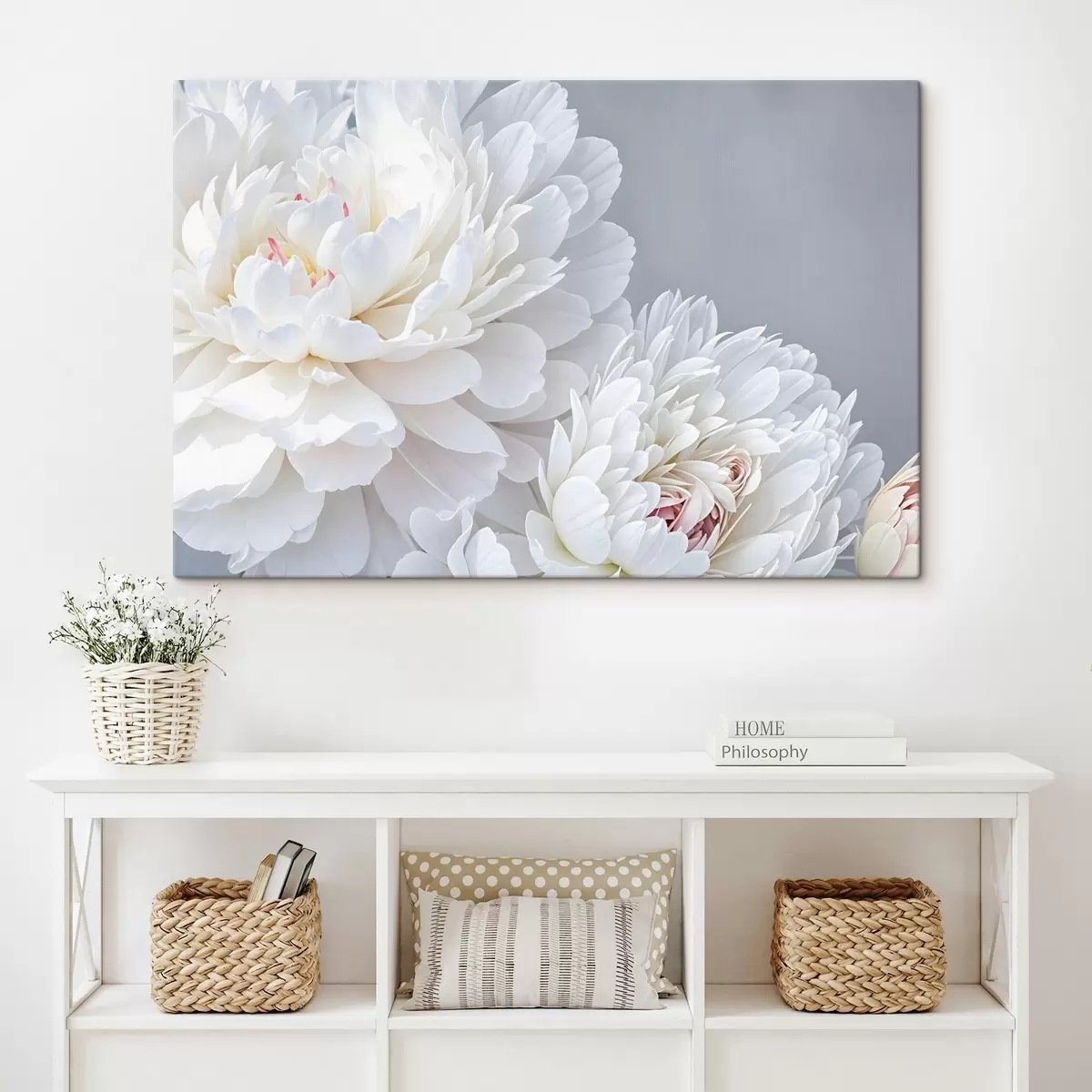 Paveikslas Balti bijūnų žiedai su švelniais, subtiliais žiedlapiais šviesiai pilkame fone Nr s41085