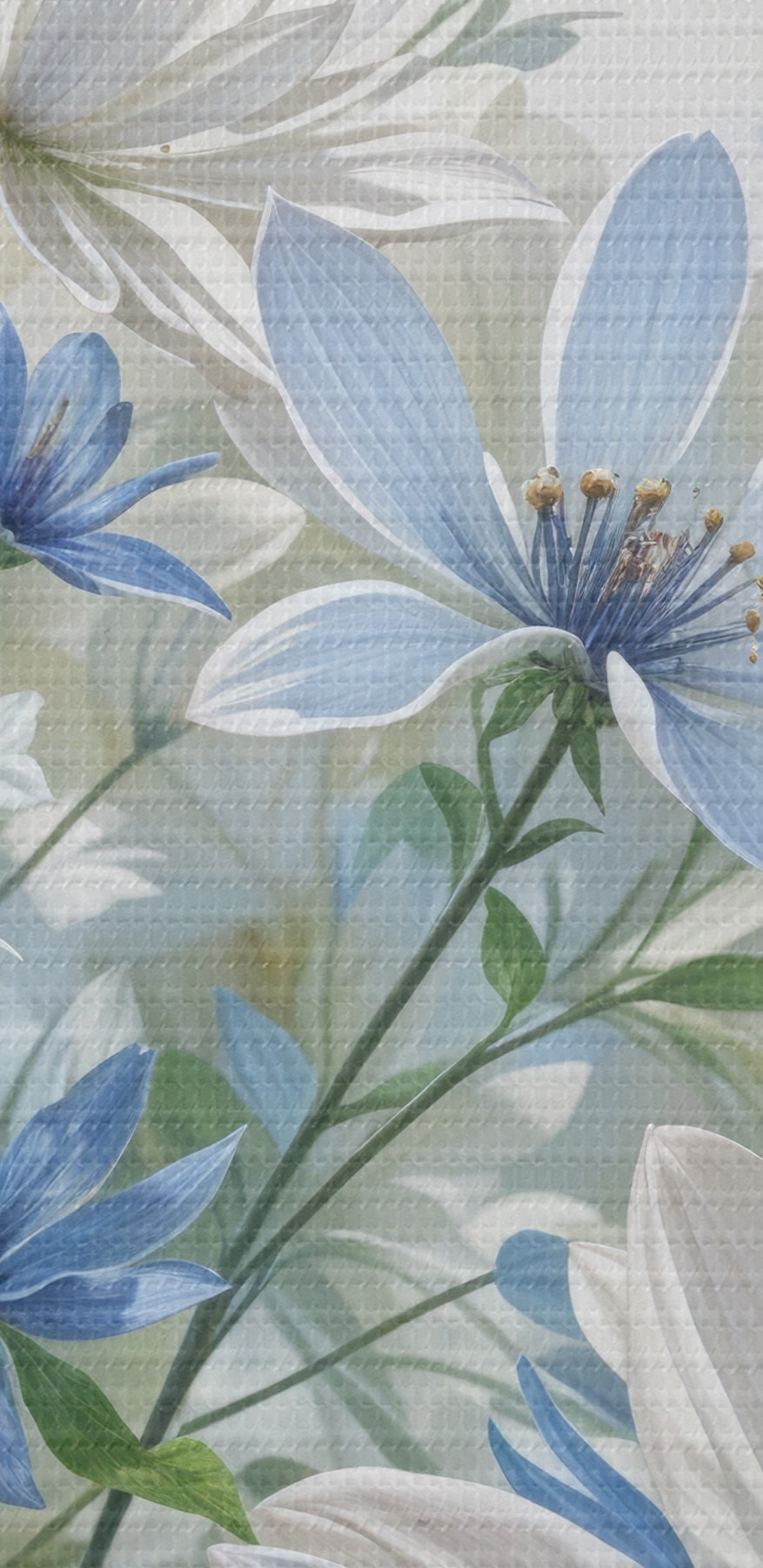 Paveikslas Baltų ir mėlynų margaspalvių gėlių laukas su žaliais lapais ir stiebais švelniame, neryškiame fone Nr s41086