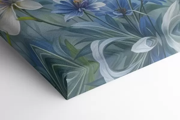 Paveikslas Baltų ir mėlynų margaspalvių gėlių laukas su žaliais lapais ir stiebais švelniame, neryškiame fone Nr s41086