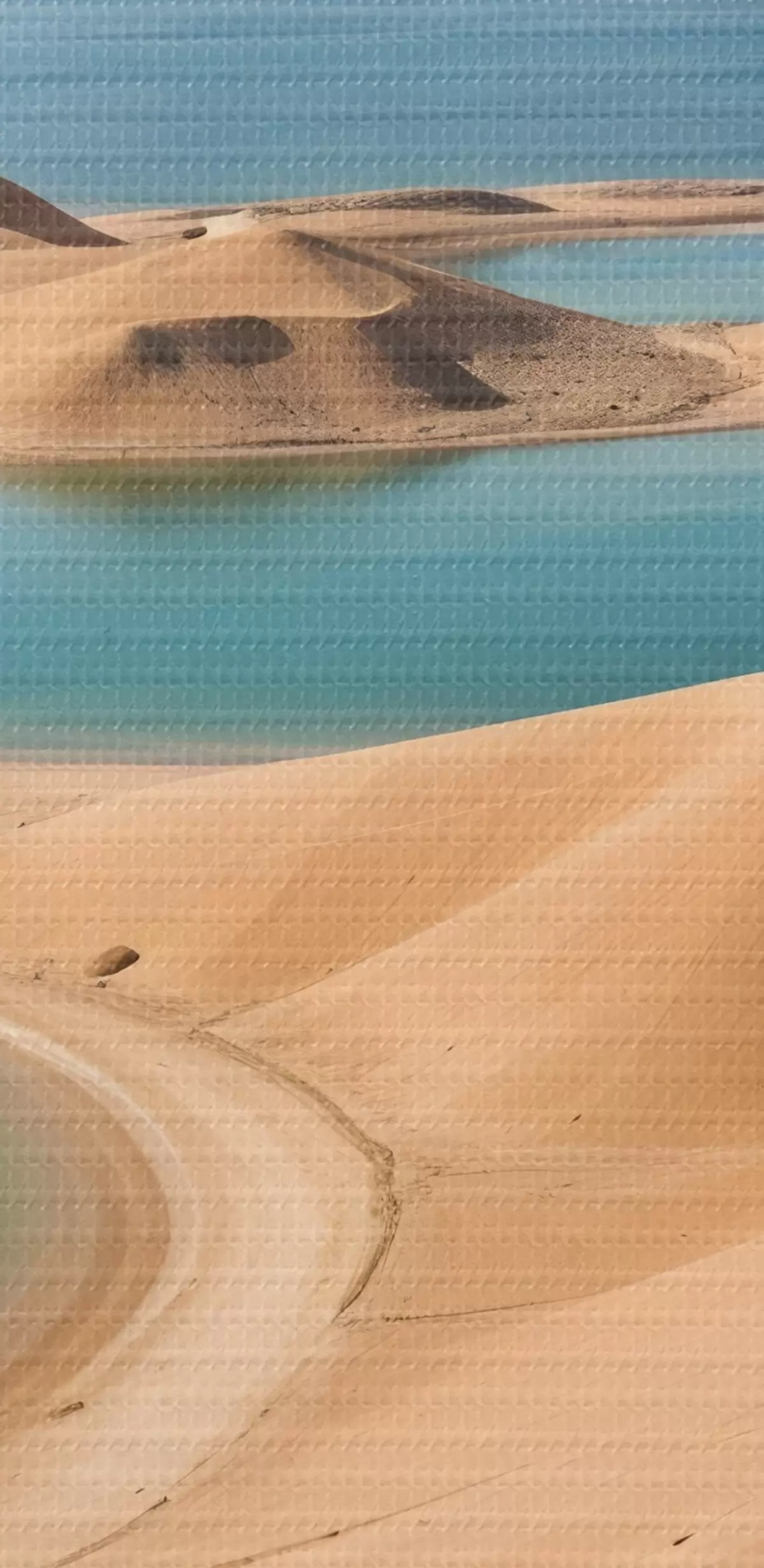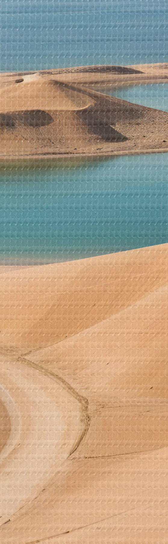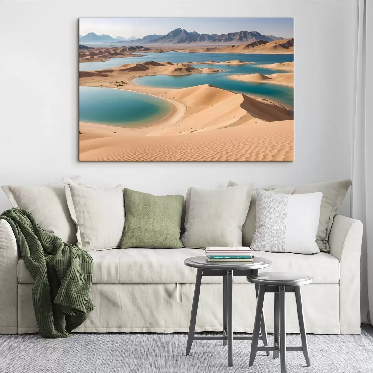 Paveikslas Didžiulis dykumos kraštovaizdis su banguojančiomis smėlio kopomis ir turkio spalvos ežerais, apsuptas raižytų kalnų Nr s41087