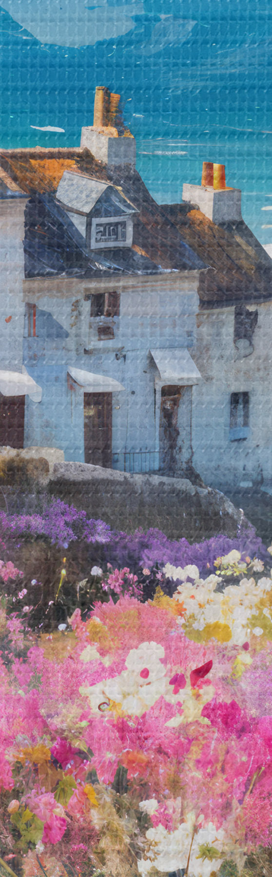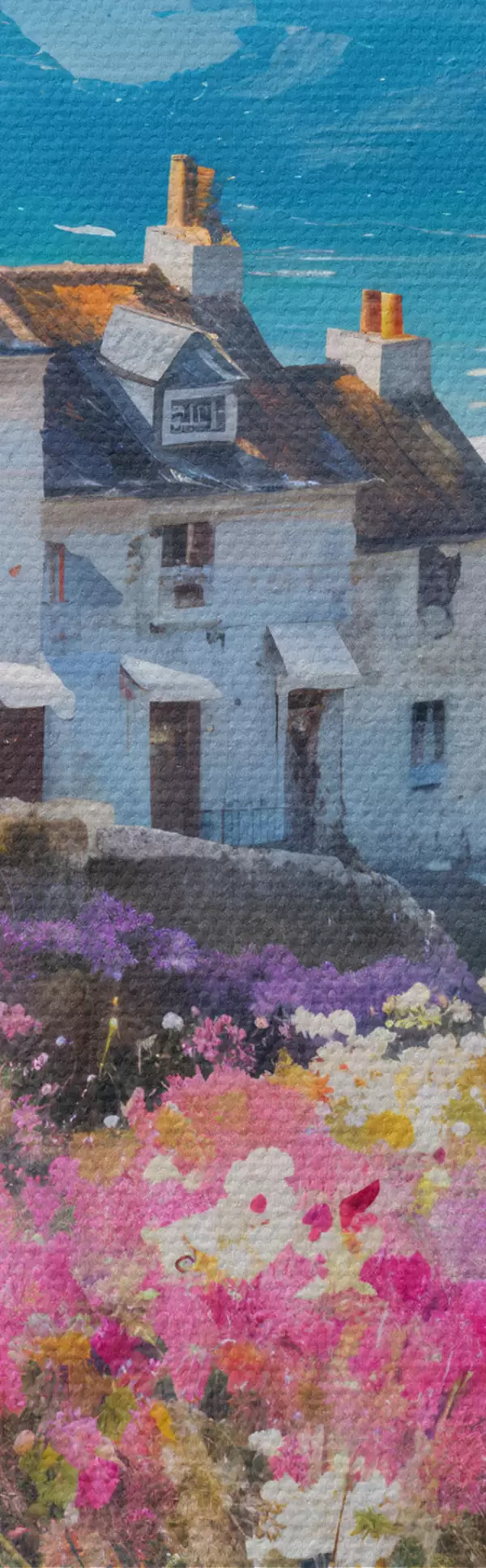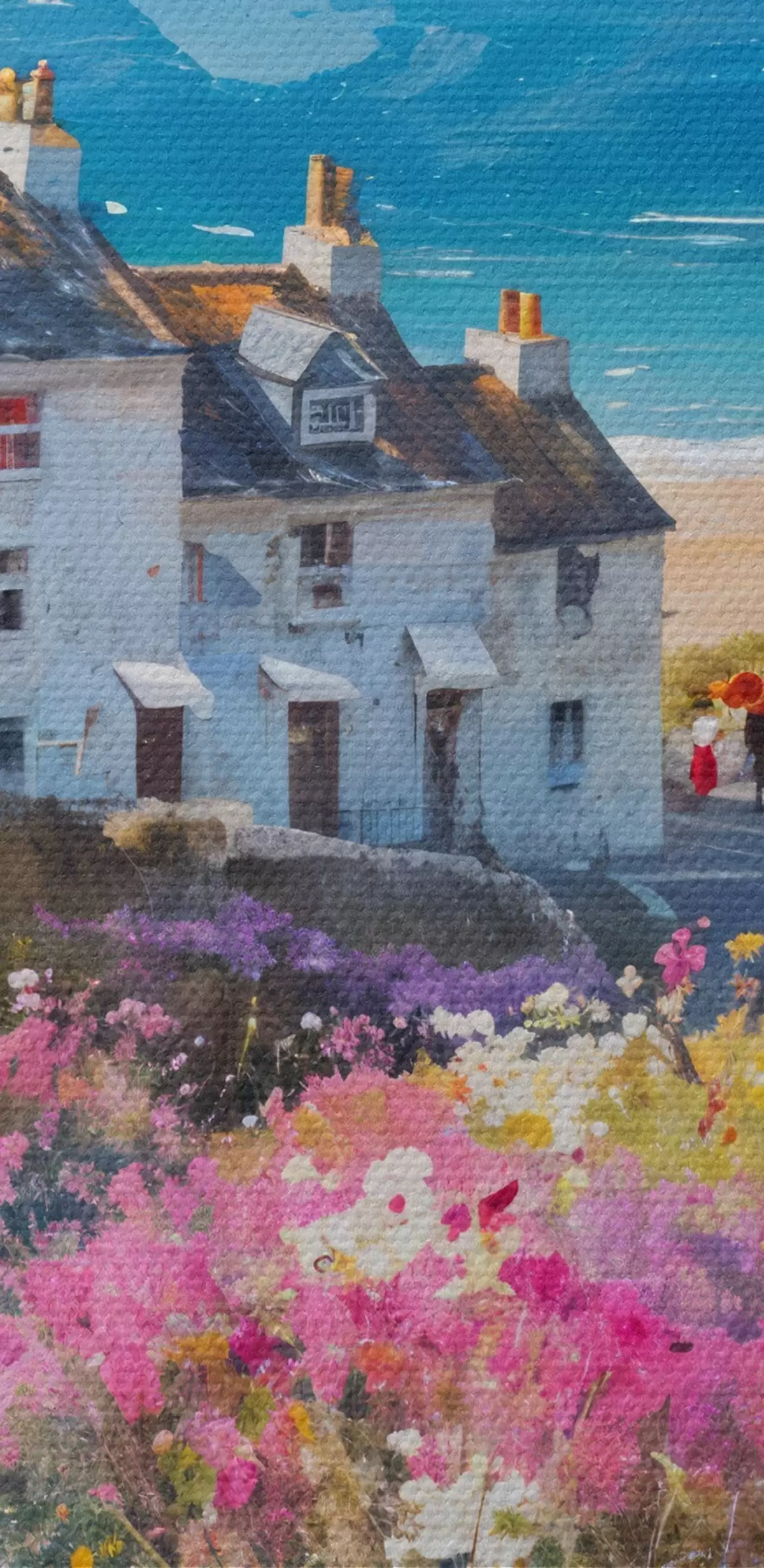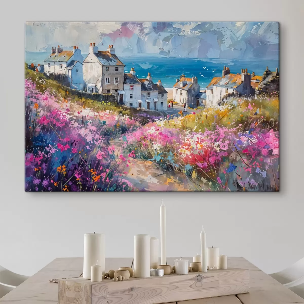 Paveikslas Spalvingas aliejiniais dažais tapytas pakrantės miestelis su baltais namais ir gyvybingu gėlių sodu pirmame plane Nr s41090