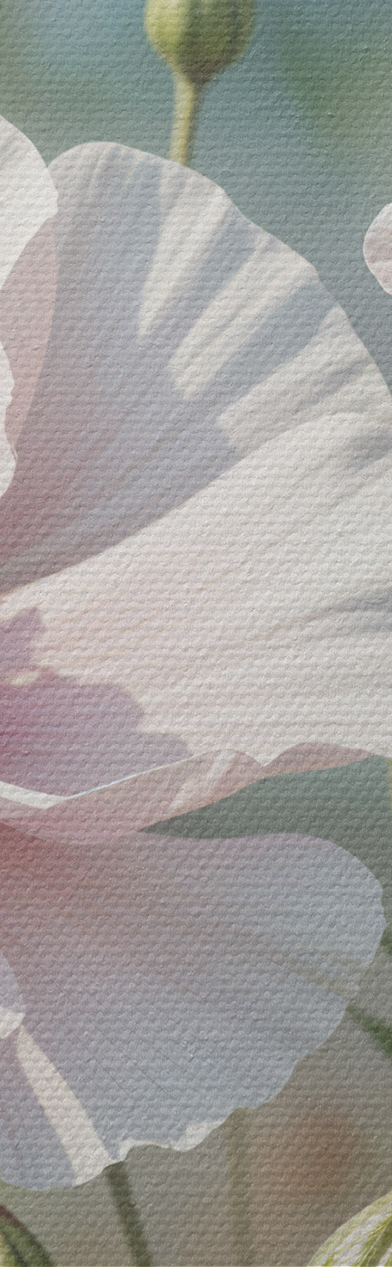 Paveikslas Švelnių, šviesiai rausvų aguonų žiedų laukas su minkštais, švelniais žiedlapiais neryškiame žaliame fone Nr s41094
