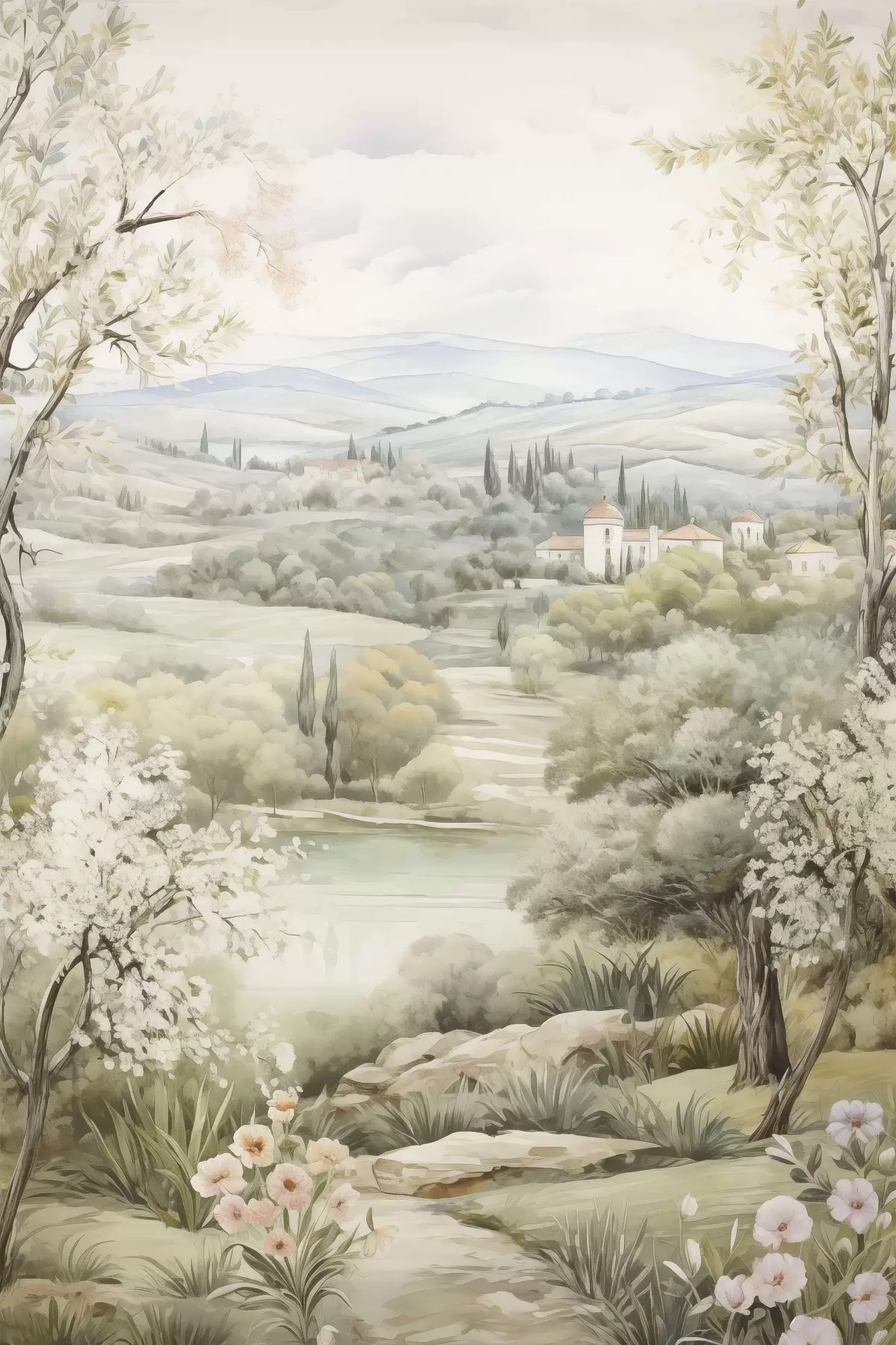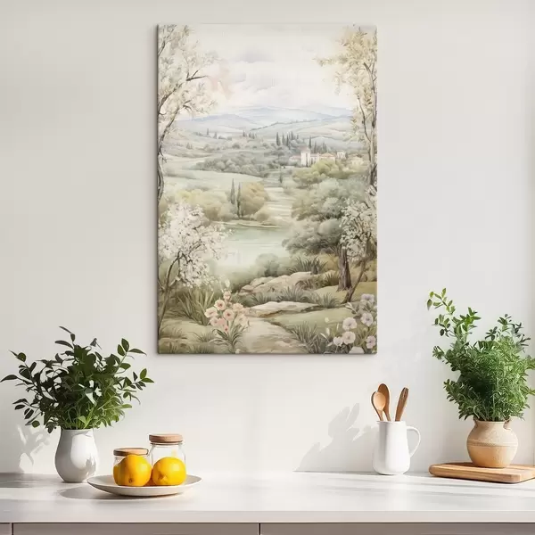 Paveikslas Gamtos žiedai, minkštos akvarelės spalvos, medžiai ir gėlės, ežeras Nr s41224
