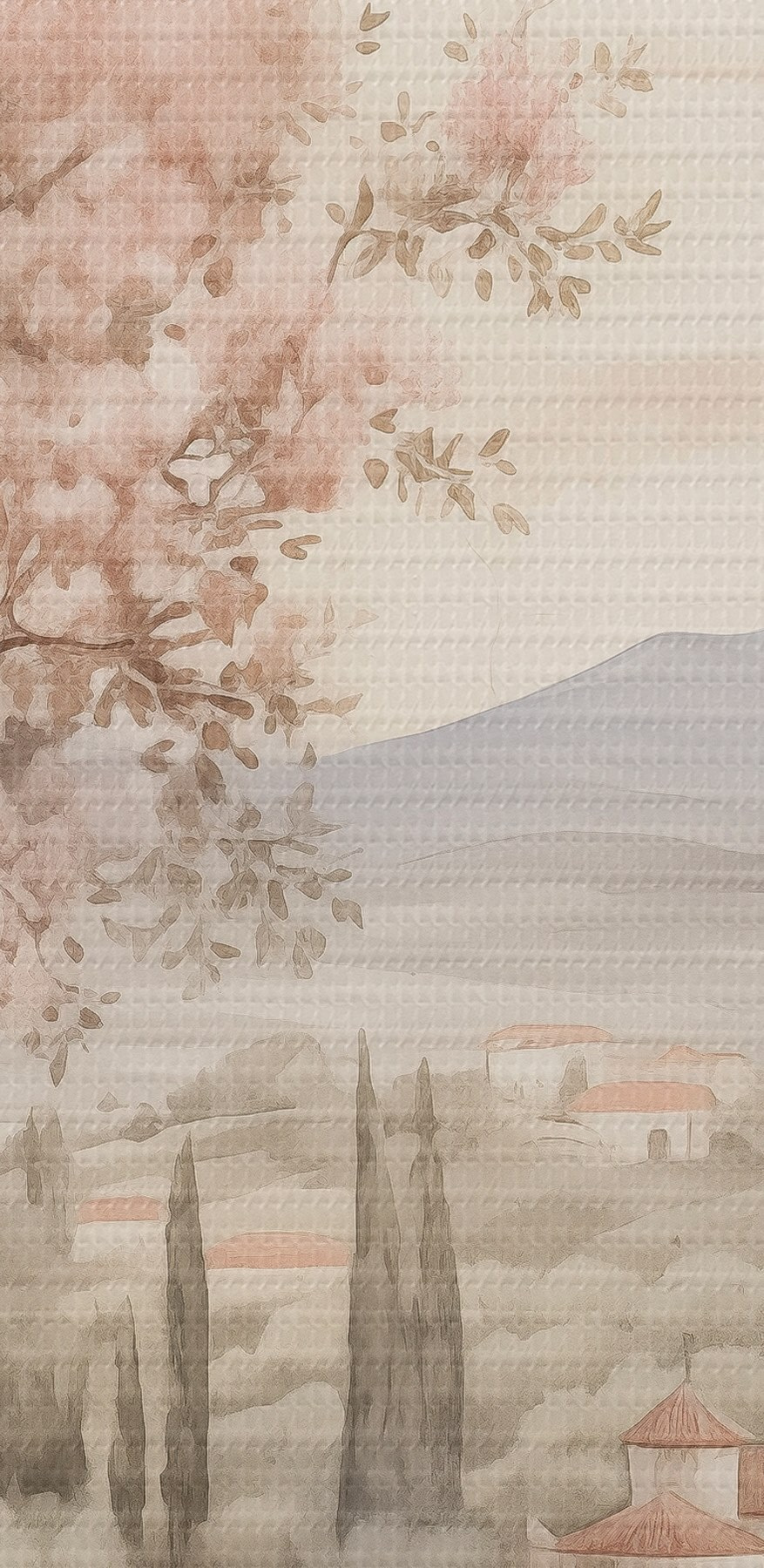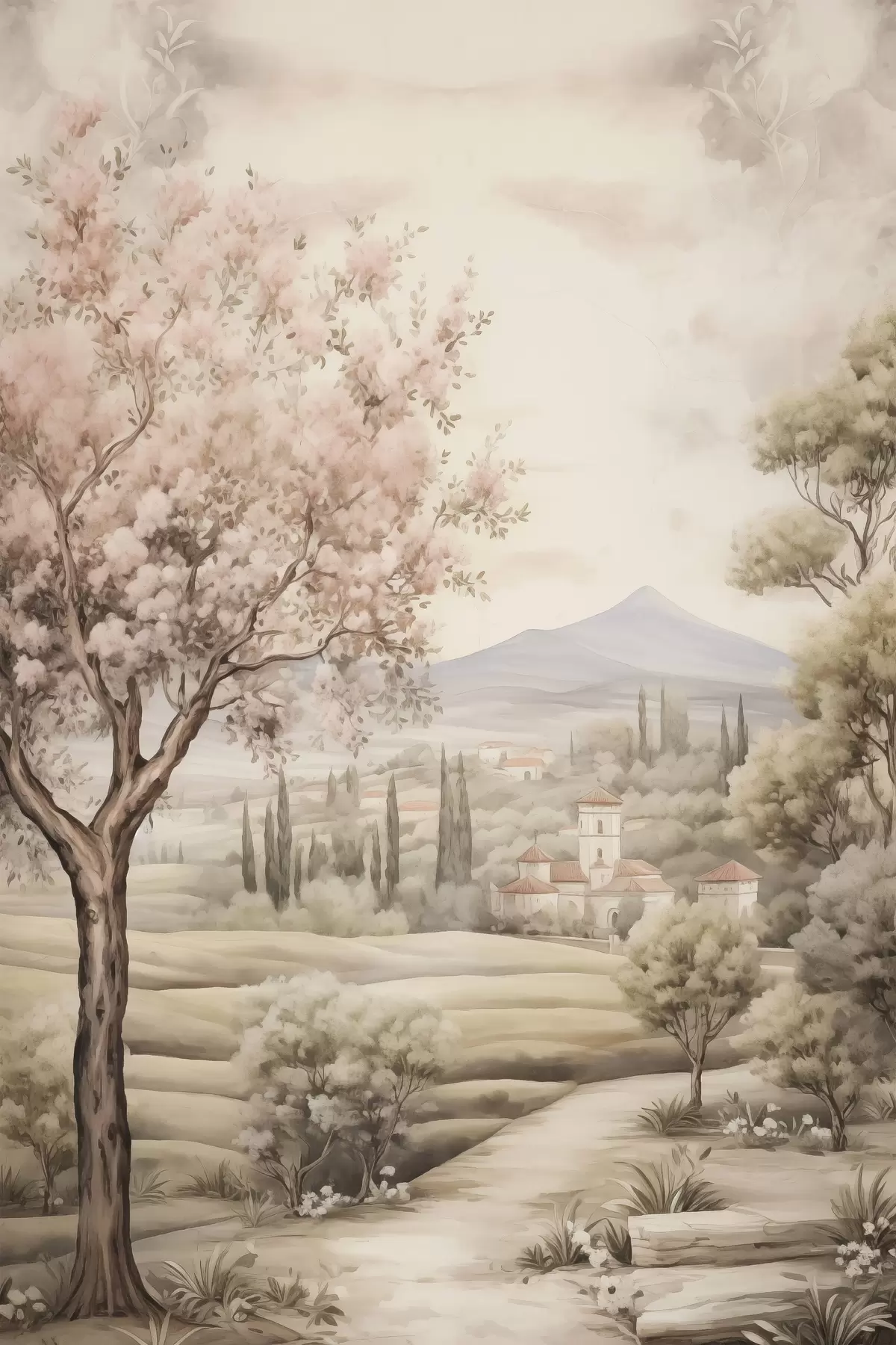 Paveikslas Akvarelės kalvos, žydinčios vyšnios, pilis, kaimiškas stilius Nr s41225