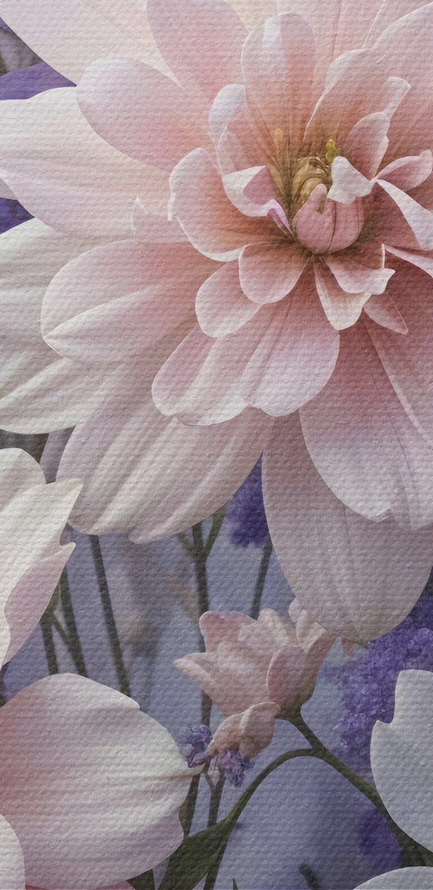 Paveikslas Didelių, gyvybingų rausvų, levandų ir baltų jurginų žiedų puokštė švelniame, neryškiame fone Nr s41247