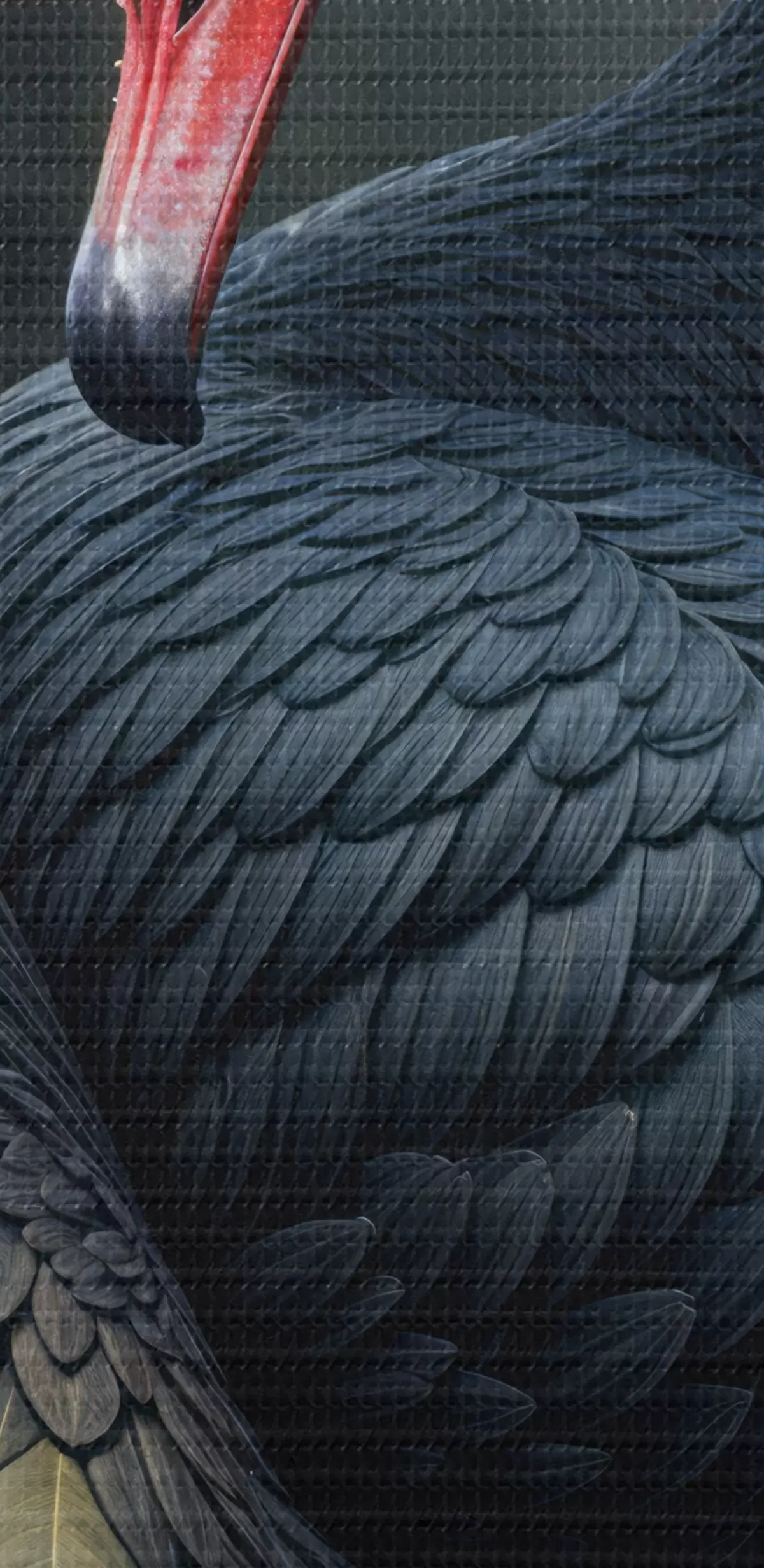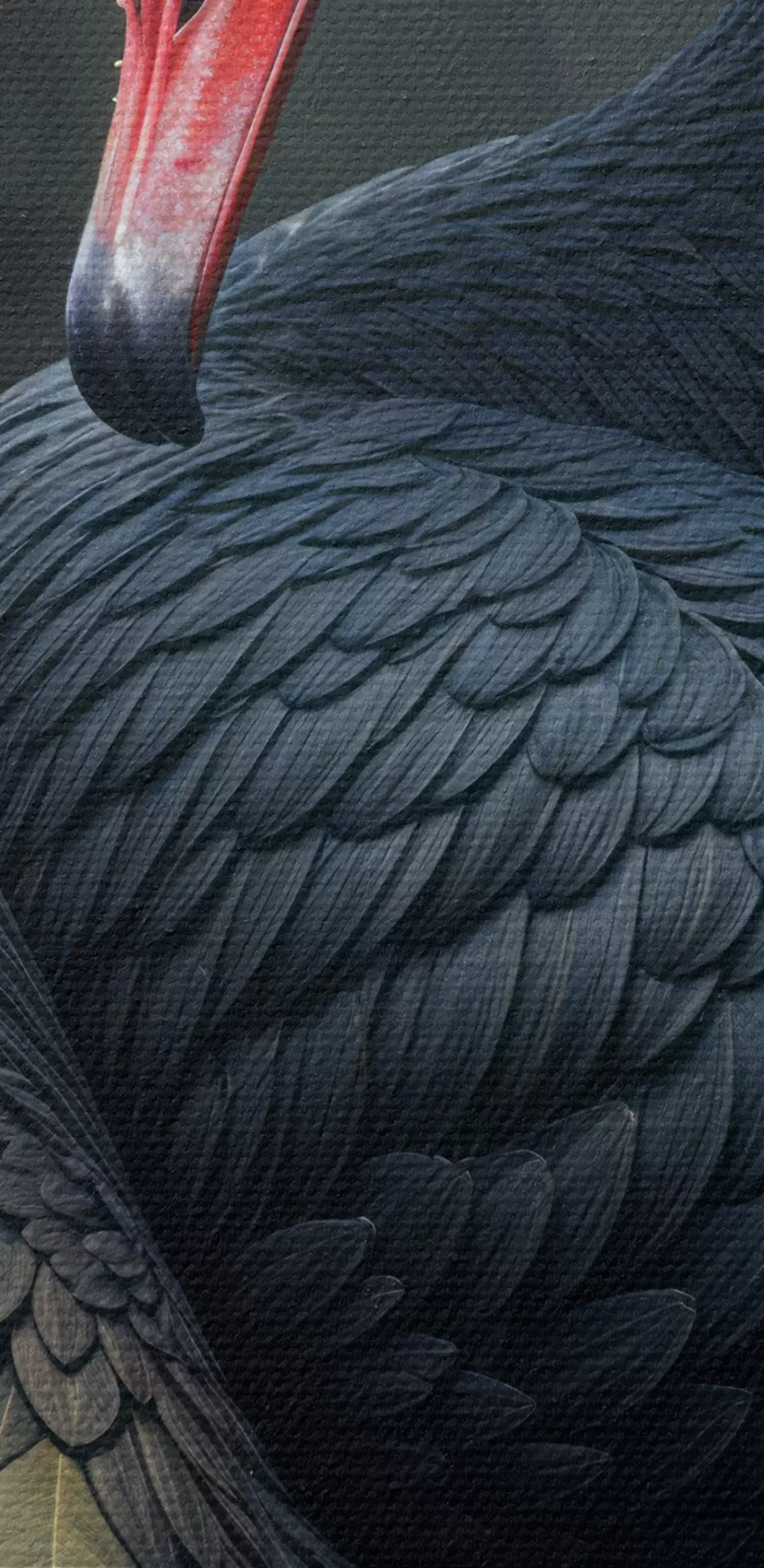 Paveikslas Juoda gulbė išskleistais sparnais, išryškinanti įspūdingas juodas plunksnas ir raudoną snapą tamsiame fone Nr s41249