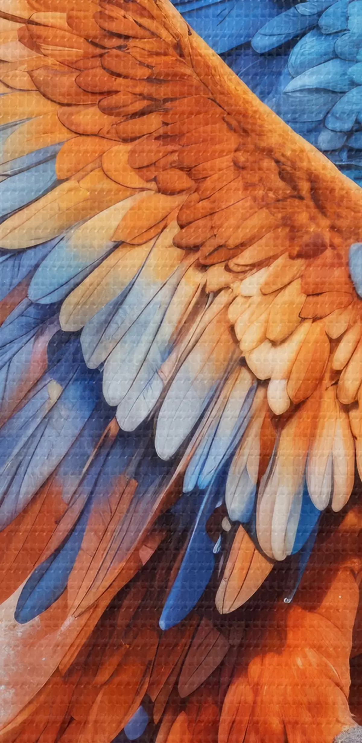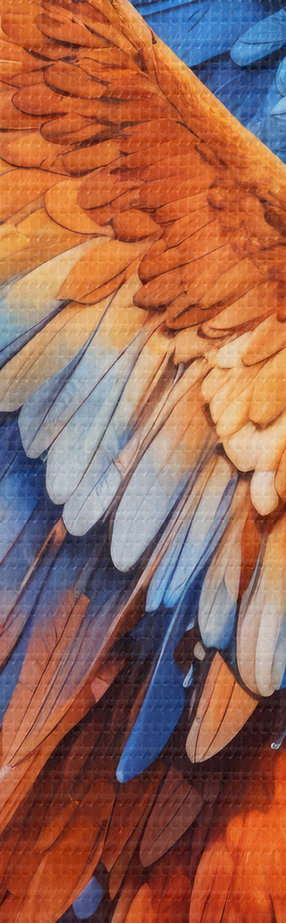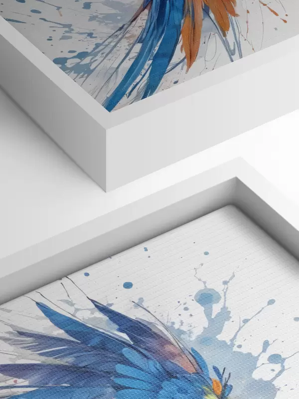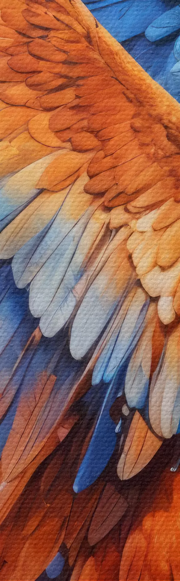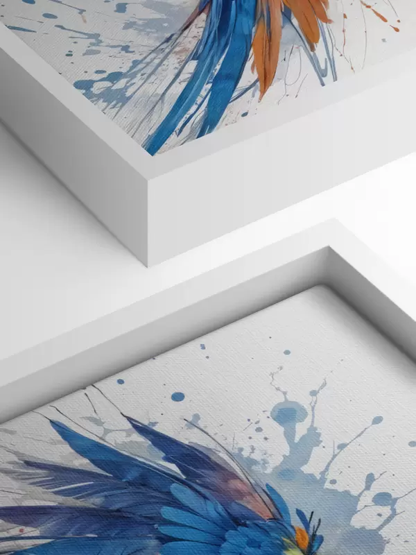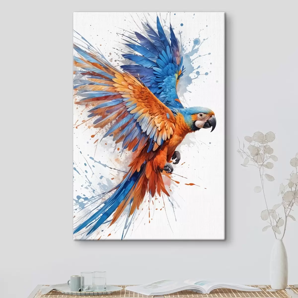 Paveikslas Spalvinga papūga su ryškiomis mėlynomis, oranžinėmis ir geltonomis plunksnomis skrenda purslų fone Nr s41250
