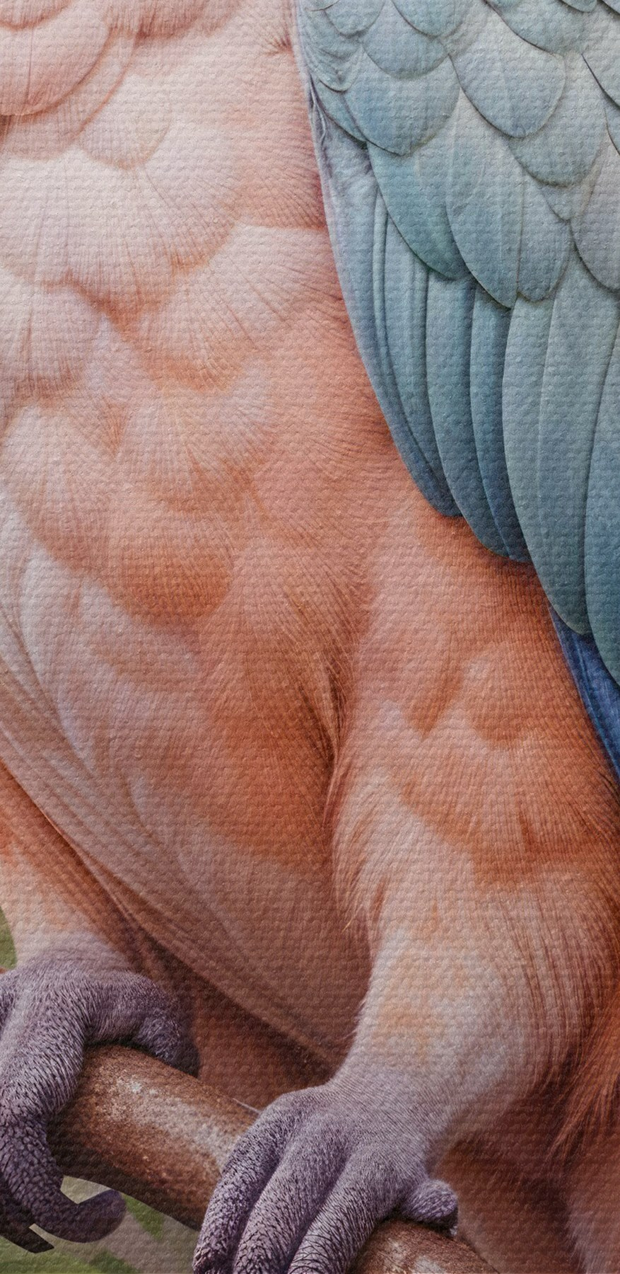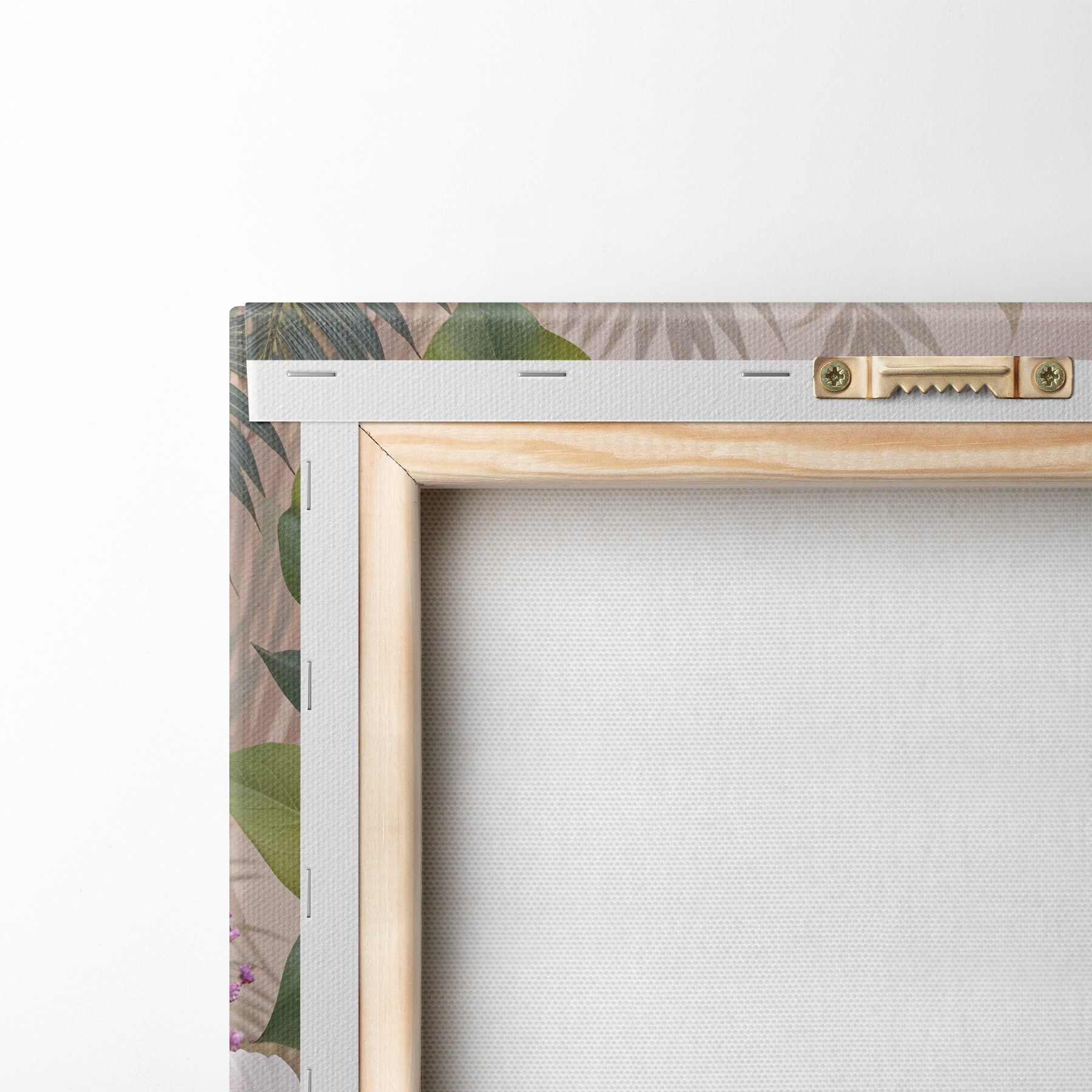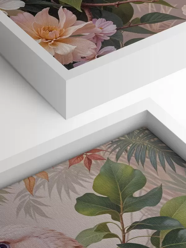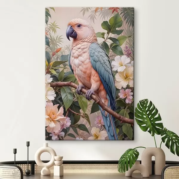 Paveikslas Spalvinga papūga rausvomis, mėlynomis ir pilkomis plunksnomis, įsitaisiusi ant šakos atogrąžų gėlių ir lapų apsuptyje Nr s41251