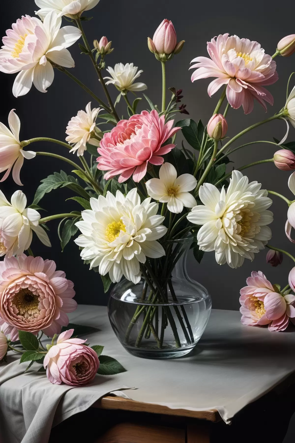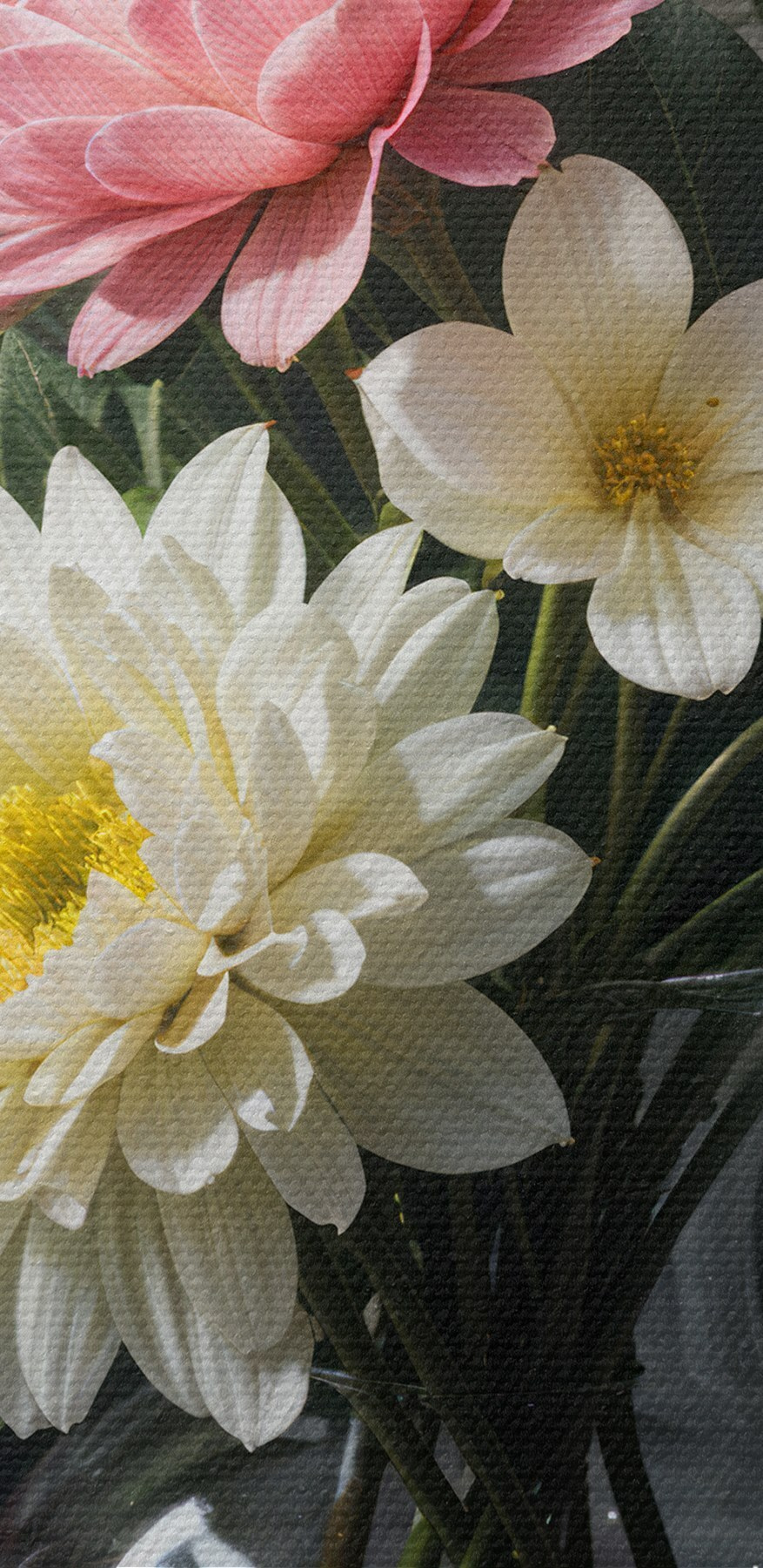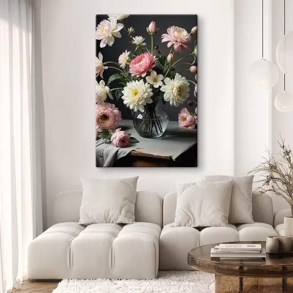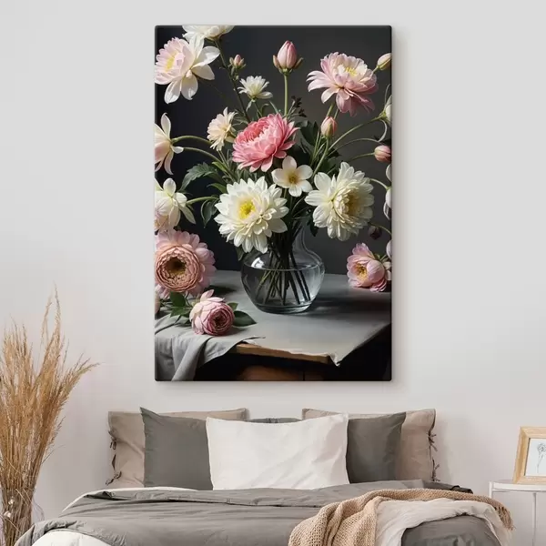 Paveikslas Ryškių rausvų, baltų ir geltonų bijūnų, jurginų ir chrizantemų gėlių puokštė stiklinėje vazoje Nr s41254