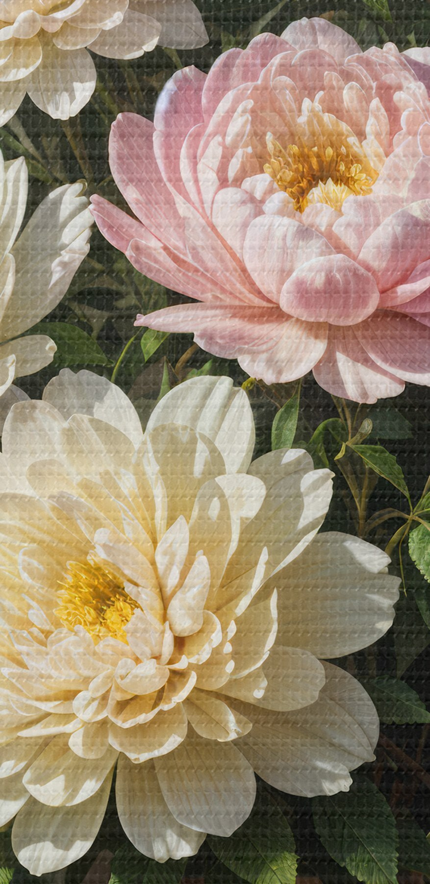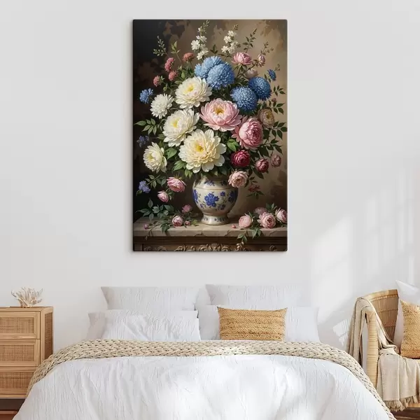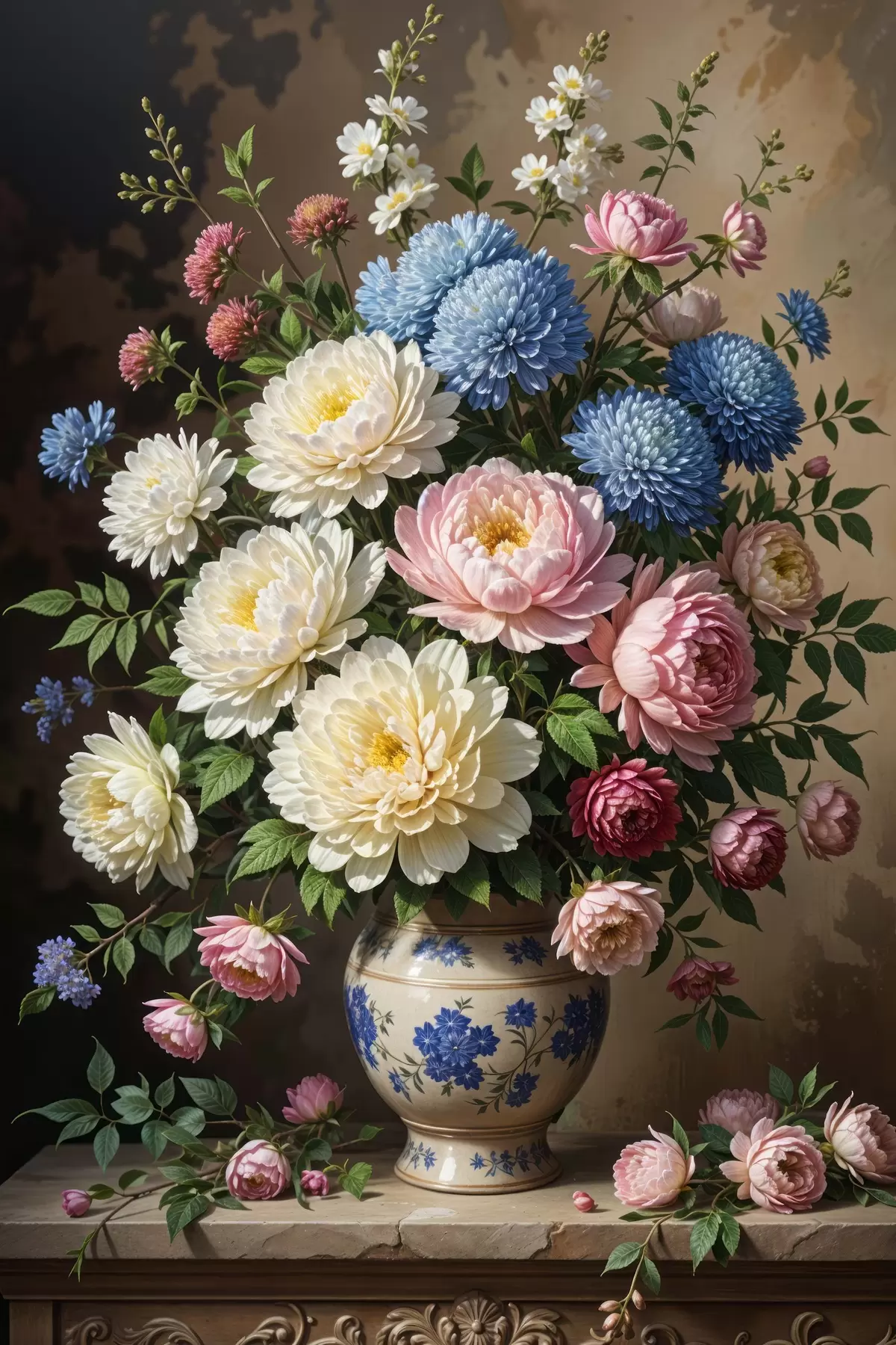 Paveikslas Spalvingų gėlių puokštė, kurią sudaro rožiniai ir balti bijūnai, mėlyni ir balti jurginai keraminėje vazoje Nr s41258
