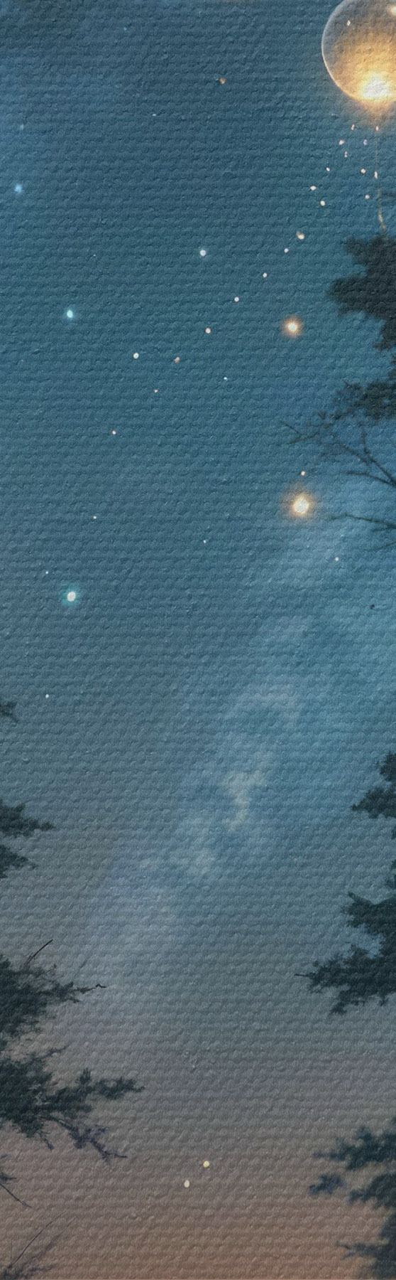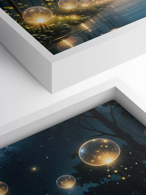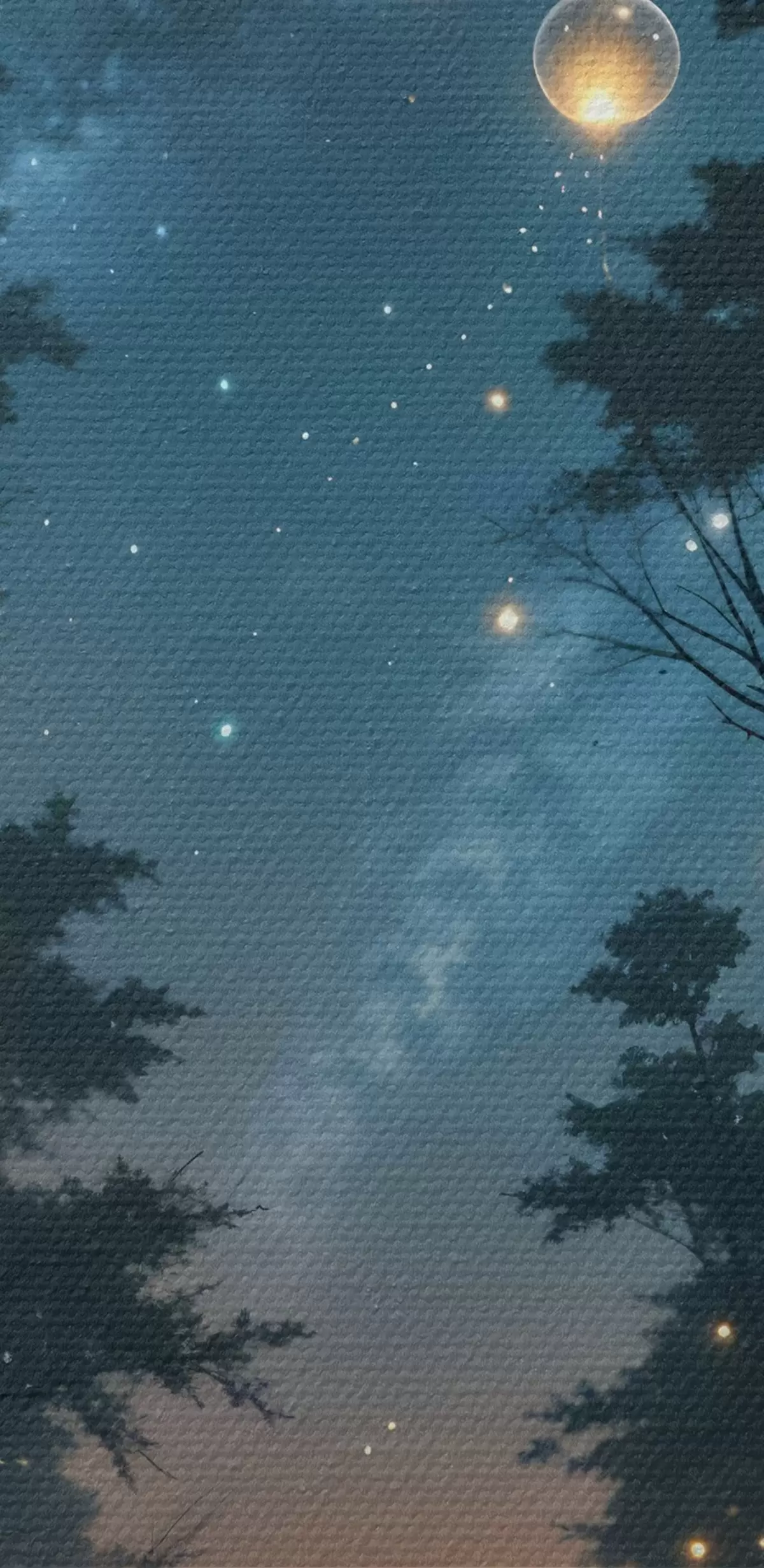 Paveikslas Stebuklingas naktinis miškas su geltonais rutuliukais ir tarp medžių plūduriuojančiomis švieselėmis, kuriančiomis nuotaikingą atmosferą Nr s41259