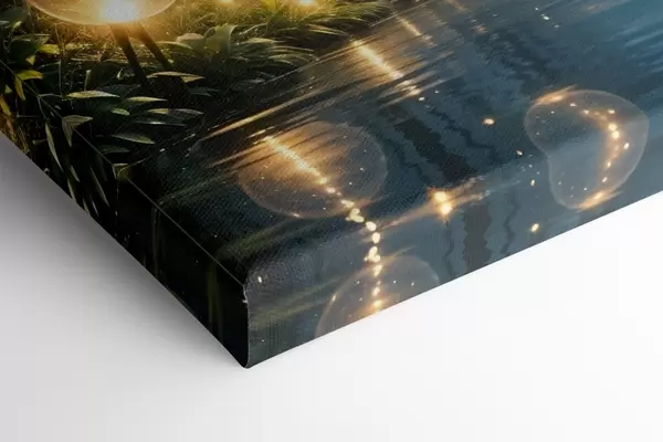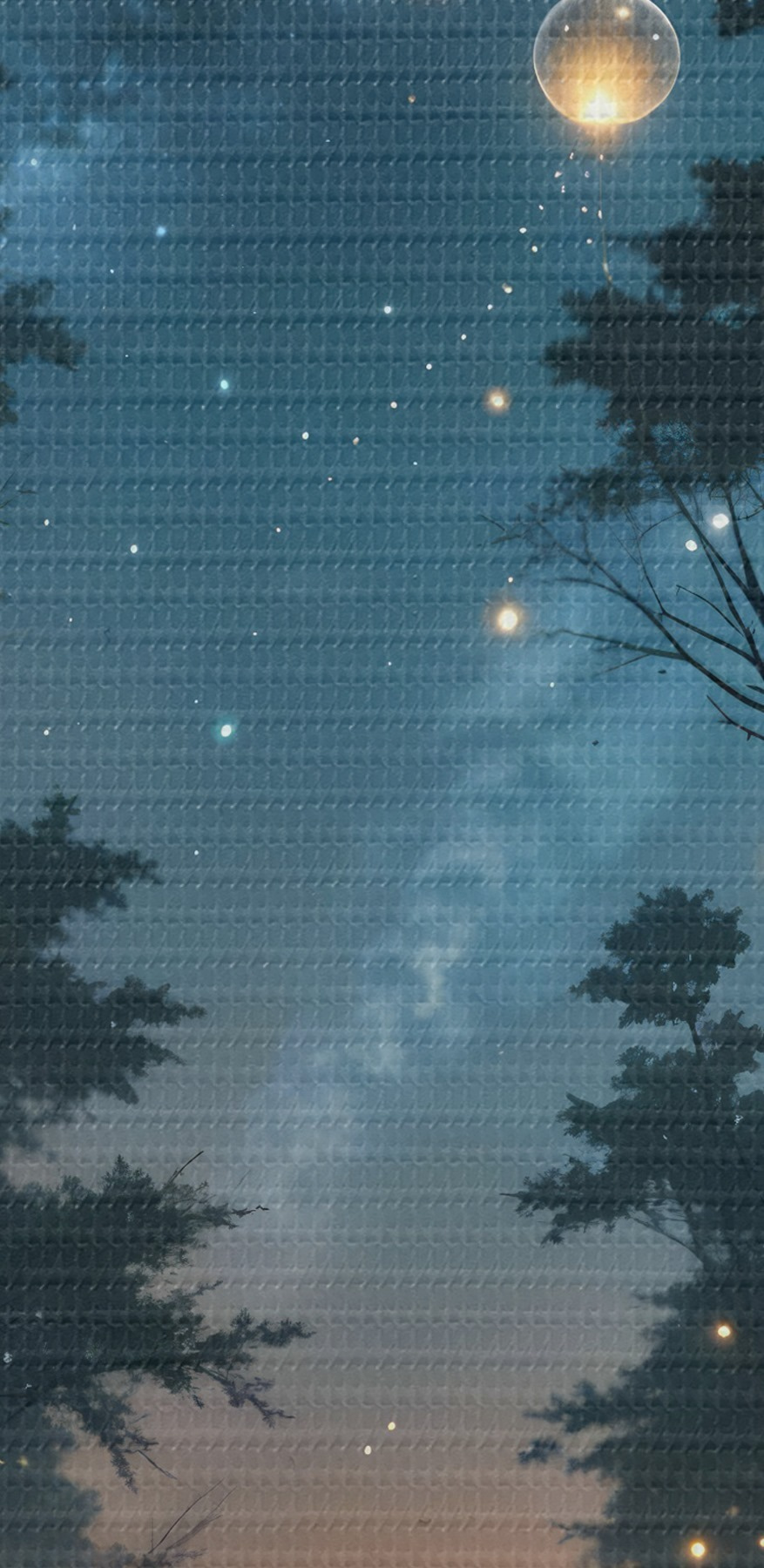 Paveikslas Stebuklingas naktinis miškas su geltonais rutuliukais ir tarp medžių plūduriuojančiomis švieselėmis, kuriančiomis nuotaikingą atmosferą Nr s41259