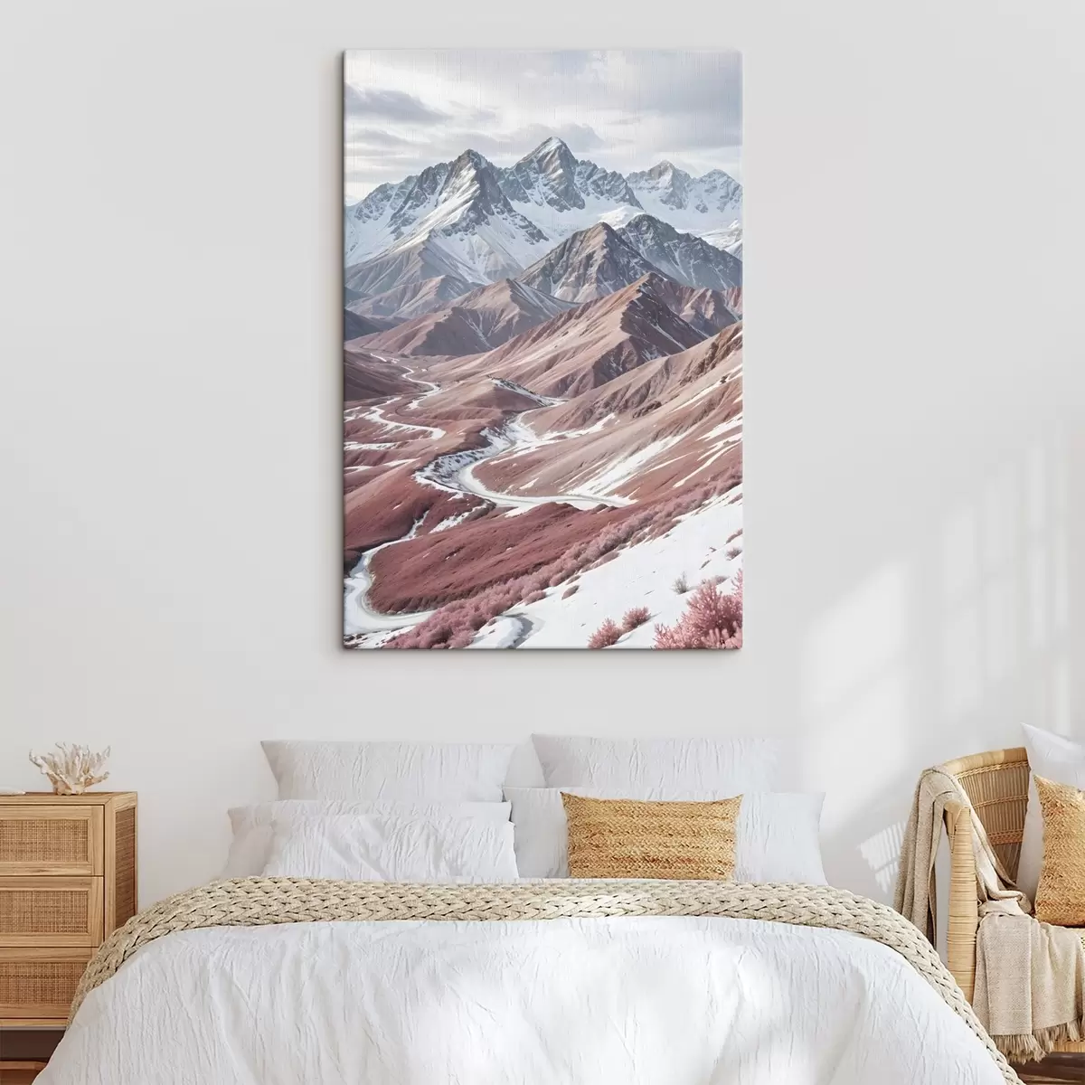 Paveikslas Snieguoti kalnai su vingiuota upe, tekančia per didžiulį, spalvingą kraštovaizdį Nr s41262