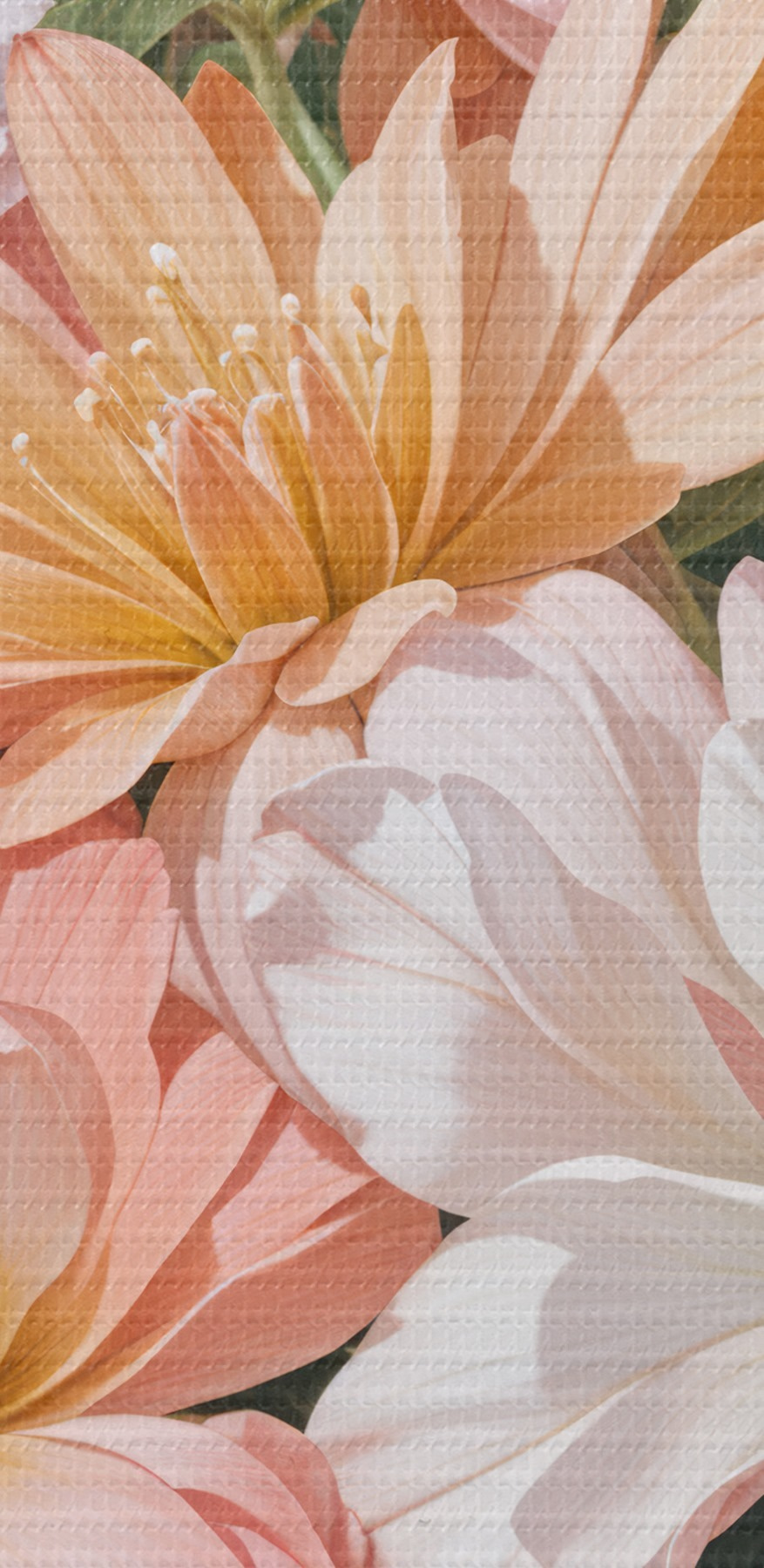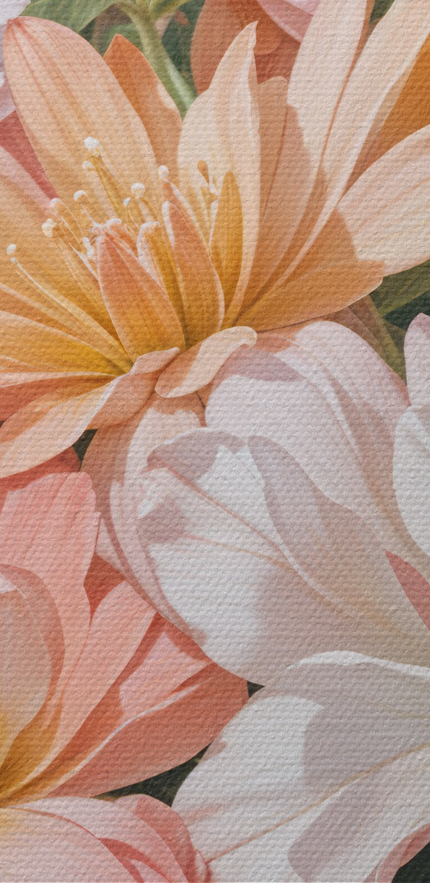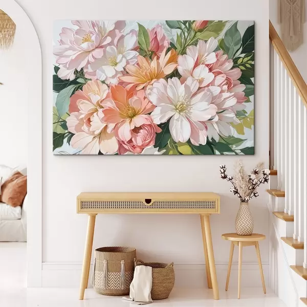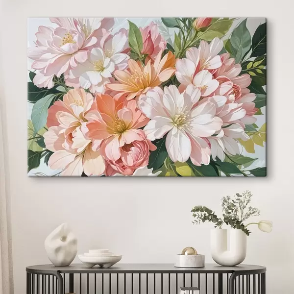 Paveikslas Ryški didelių rožinių, baltų ir oranžinių jurginų žiedų puokštė su žaliais lapais švelniai rausvame fone Nr s41267