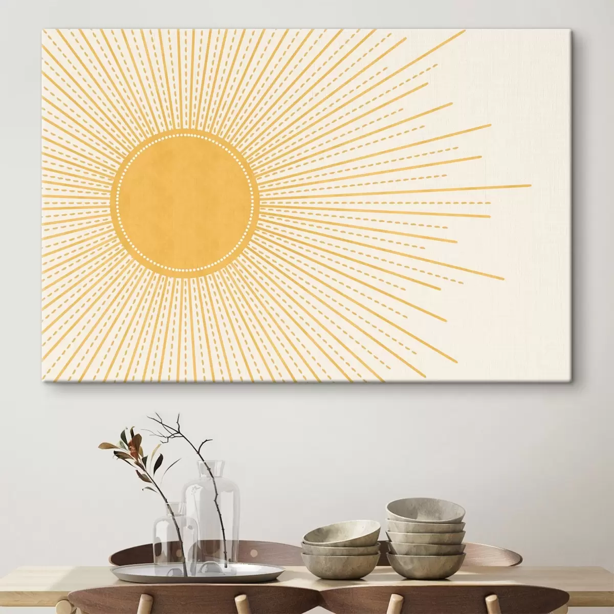 Paveikslas Ryškiai geltona saulė su sklindančiais saulės spinduliais šviesiame fone, sukurianti šiltą ir saulėtą atmosferą Nr s41268