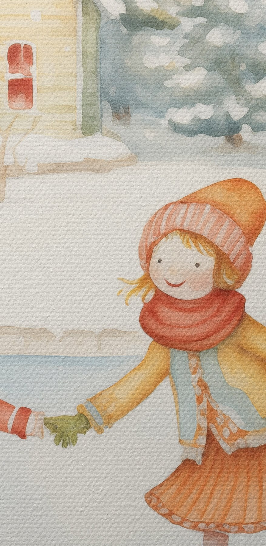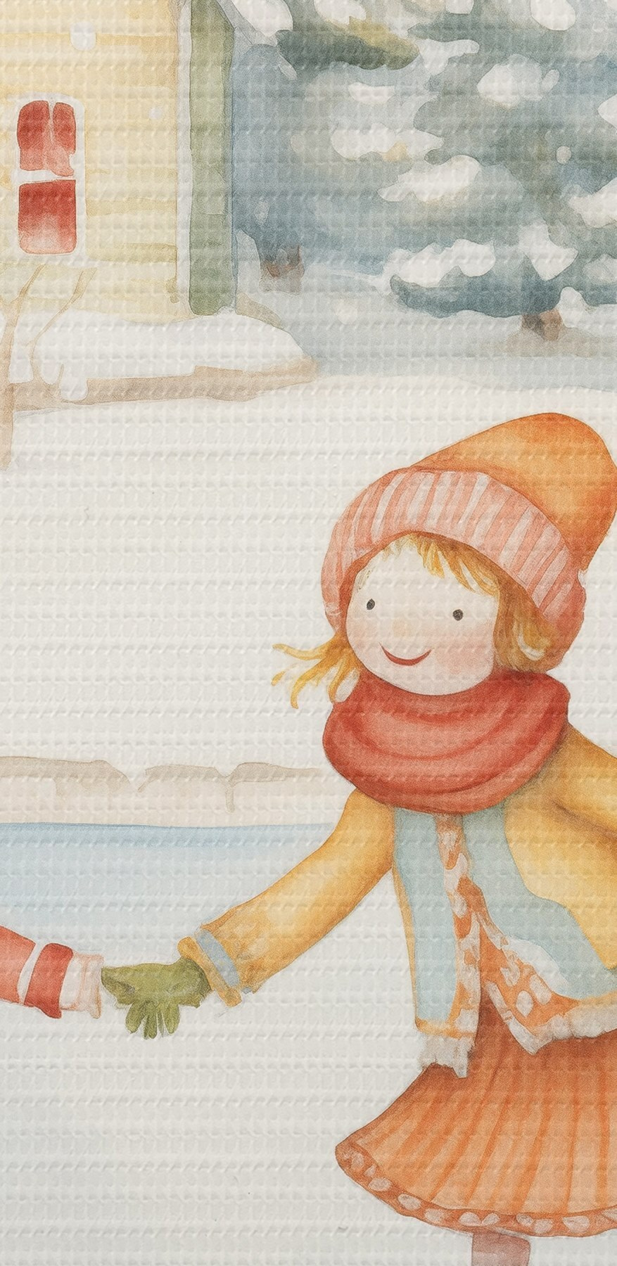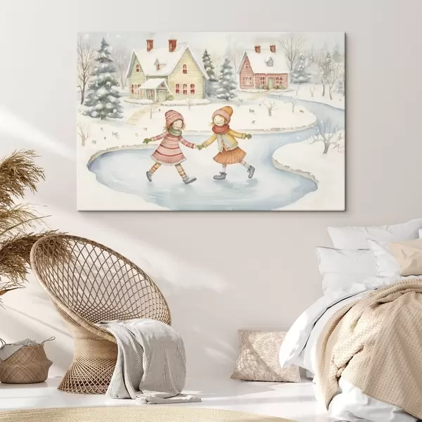 Paveikslėlis Žiemos scena su dviem mergaitėmis, čiuožiančiomis ant ledo, žiemos miestas, namai, miškas s41377