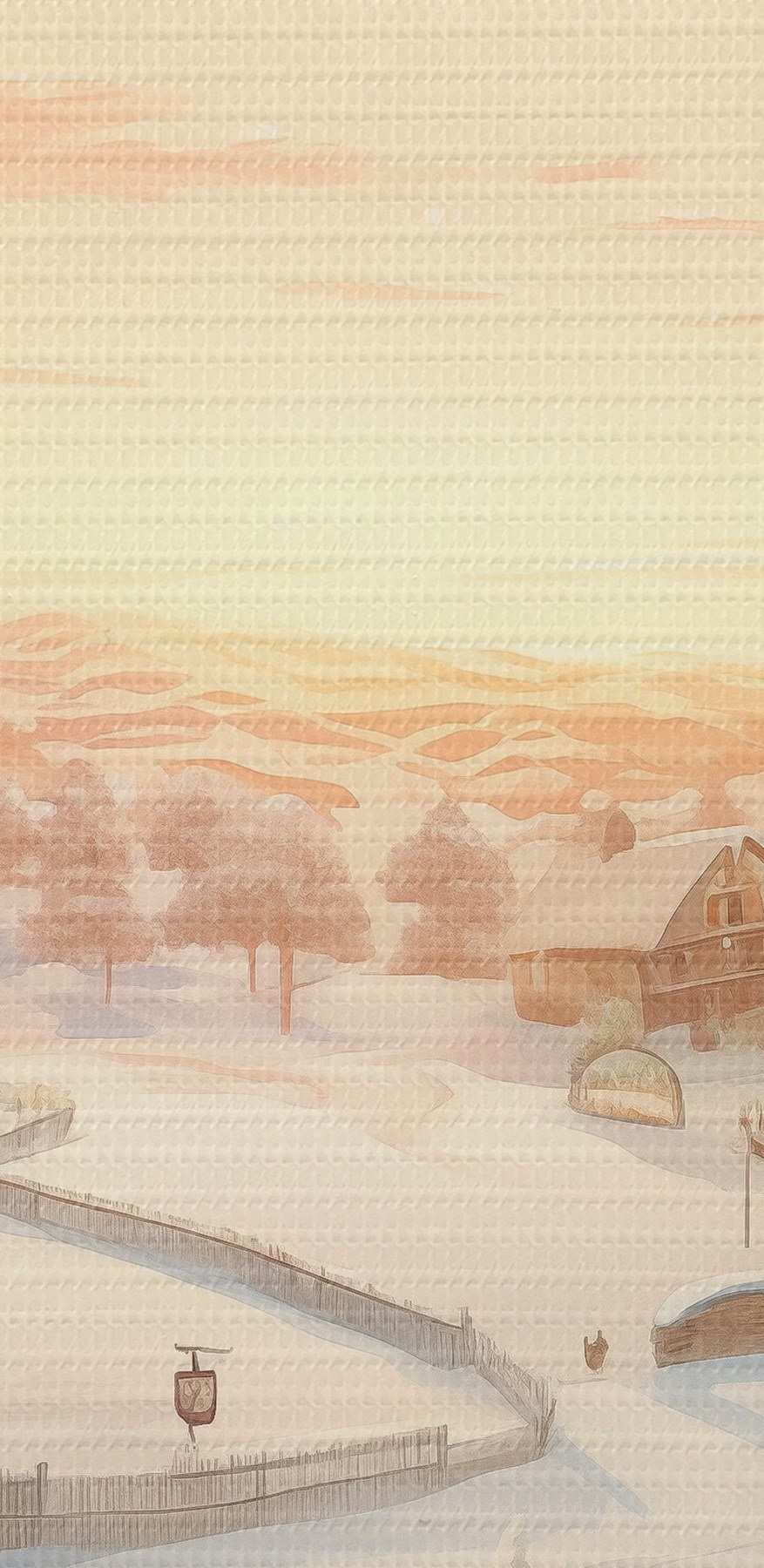 Paveikslas Žiemos kaimas saulėlydyje, sniegu padengti namai, pušys Nr s41380