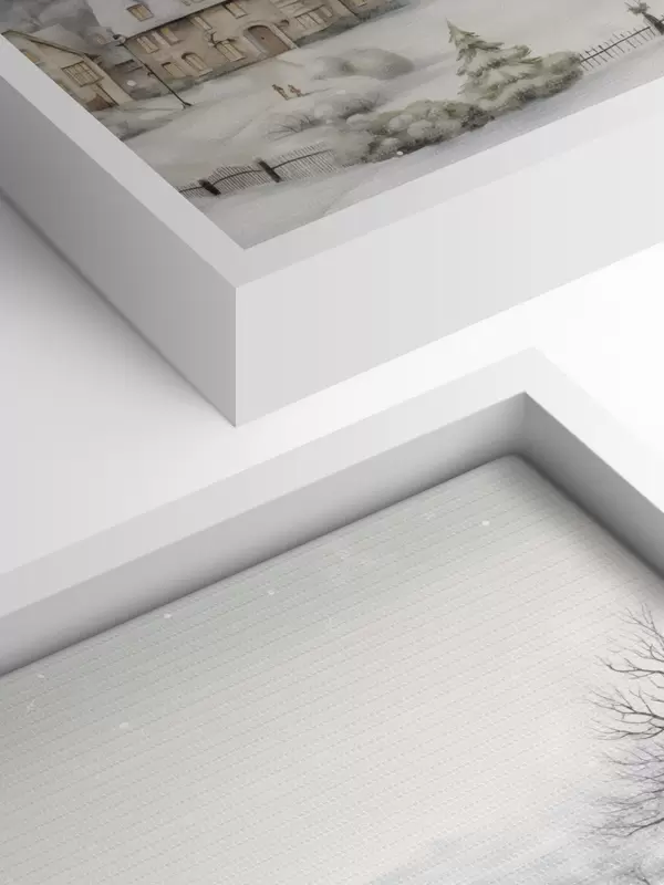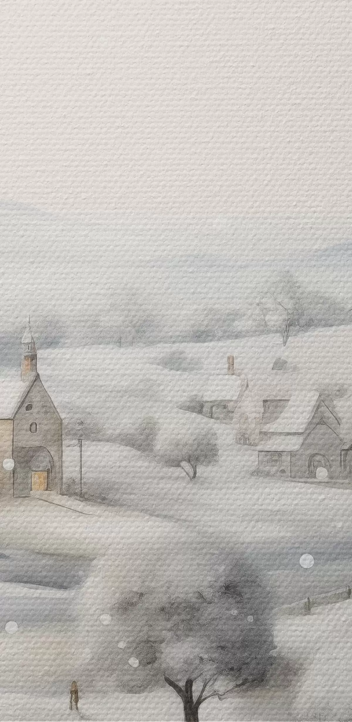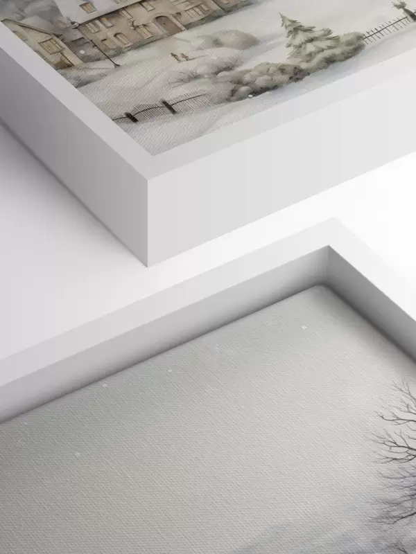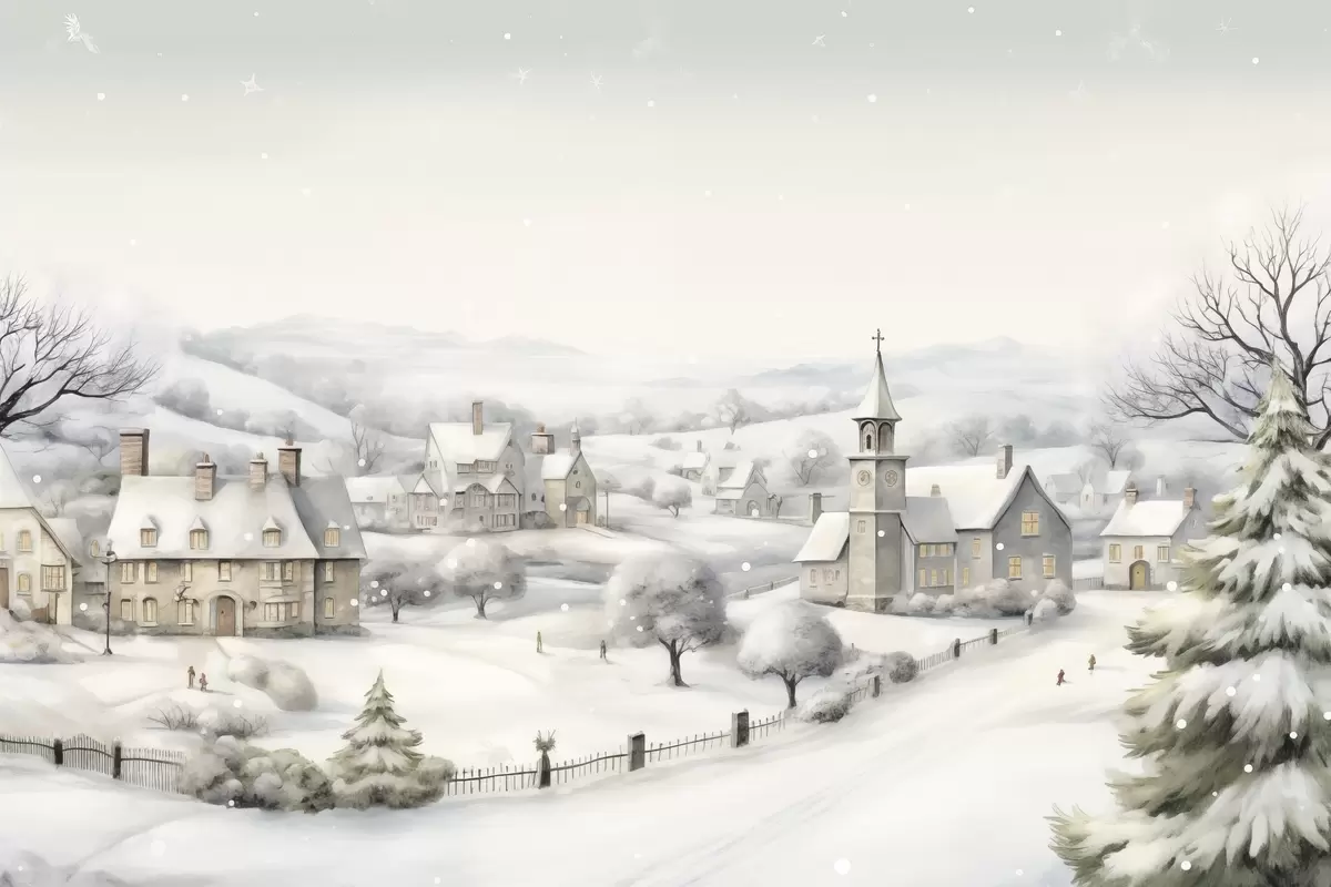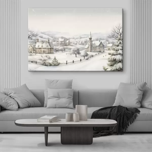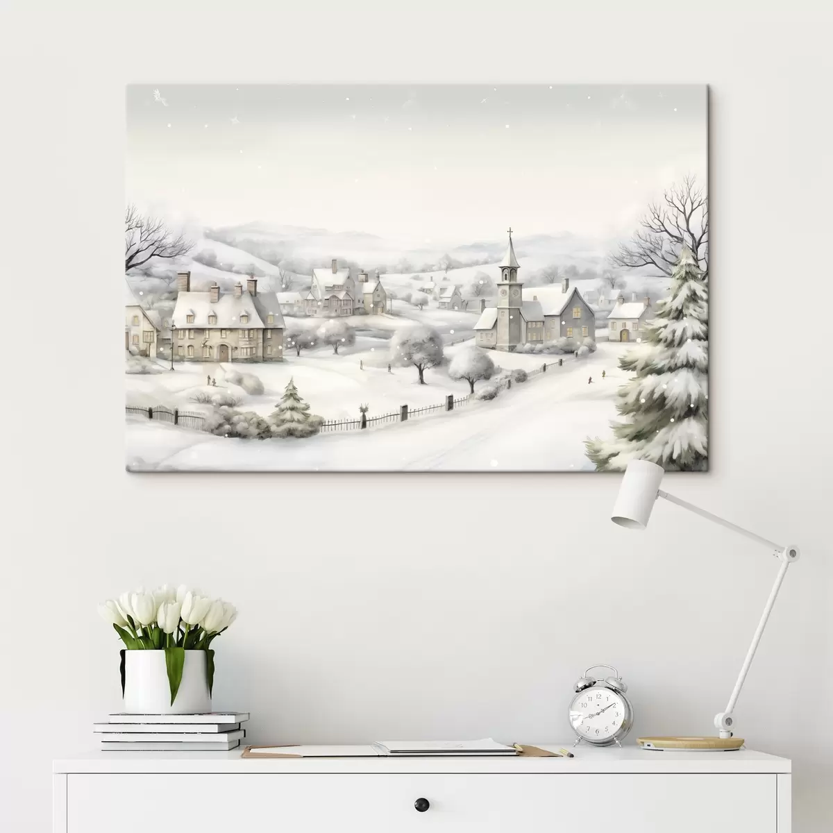Paveikslas Gražus žiemos kaimas, medžiai, namai, akvarelė, kalnai Nr s41382