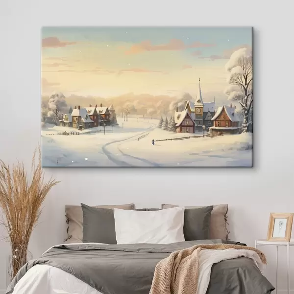 Paveikslas Žiemos stebuklų šalis, namai, saulėlydžio dangus, medžiai, akvarelė Nr s41383