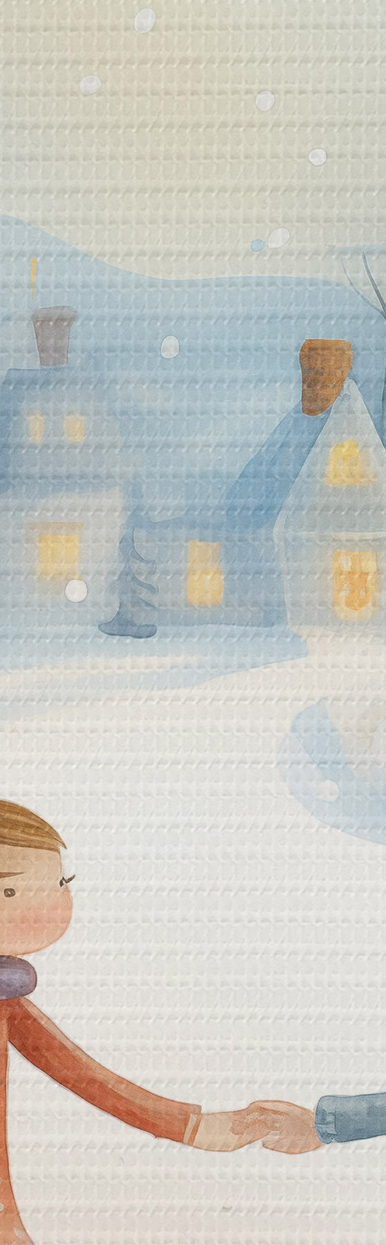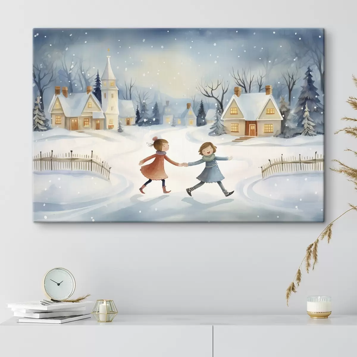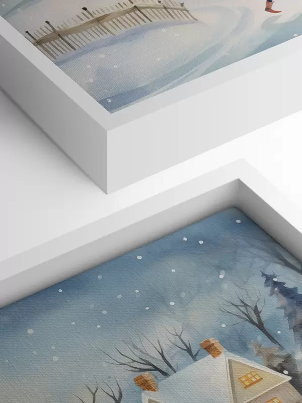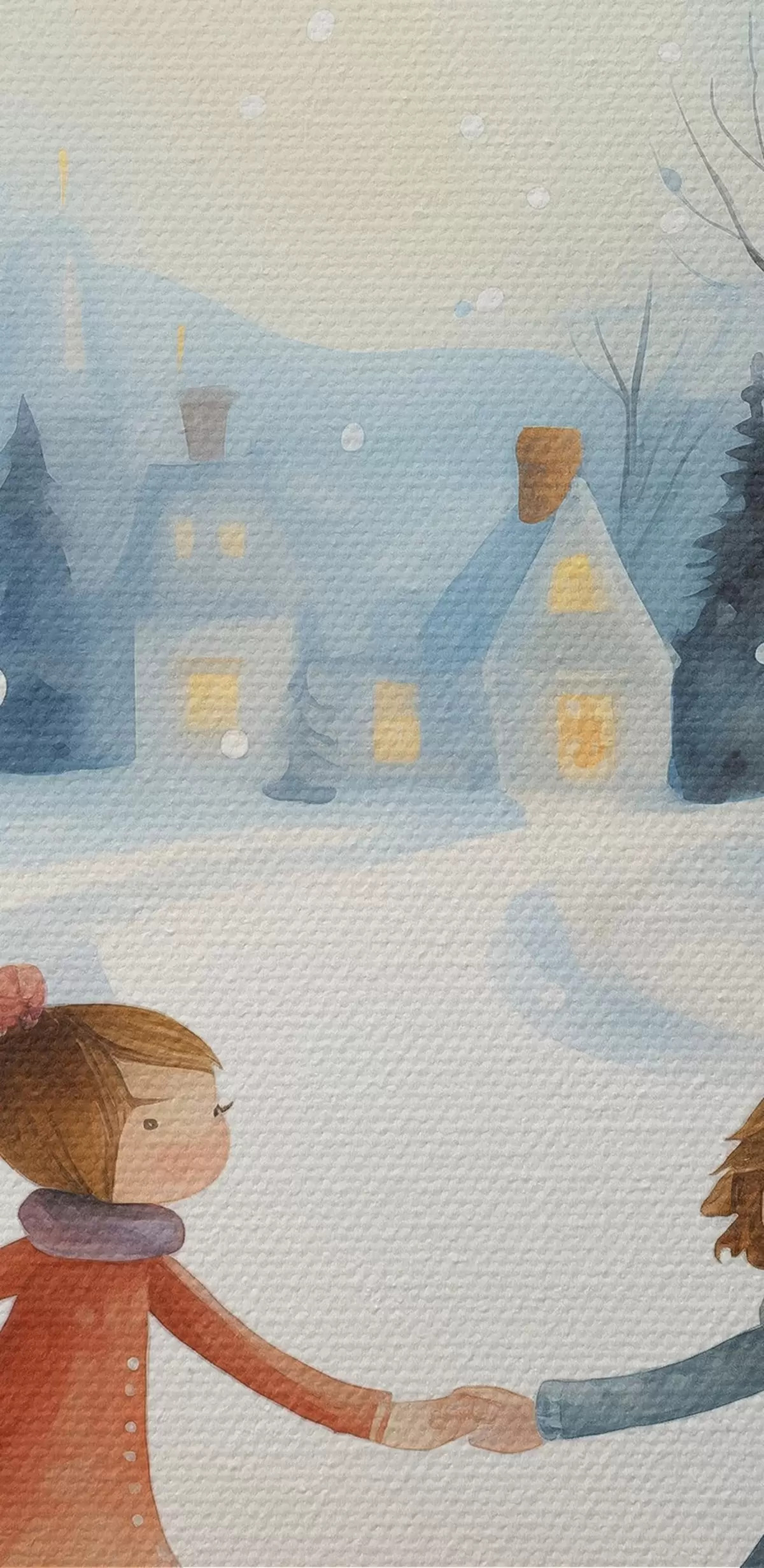 Paveikslas Mergaitės žiemos kaime, snaigės, akvarelė, namai, miškas Nr s41385