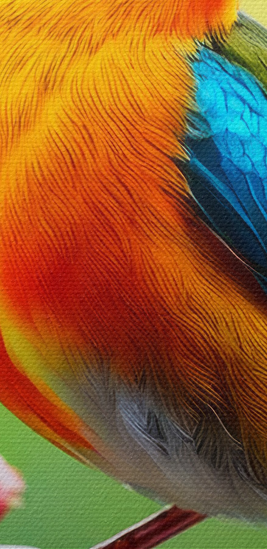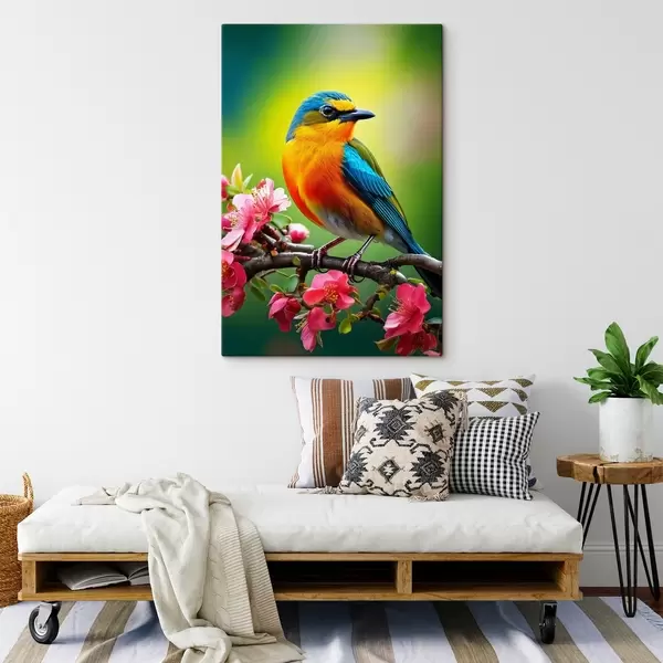 Paveikslas ryškus paukštis ant šakos su gėlėmis Nr s41412
