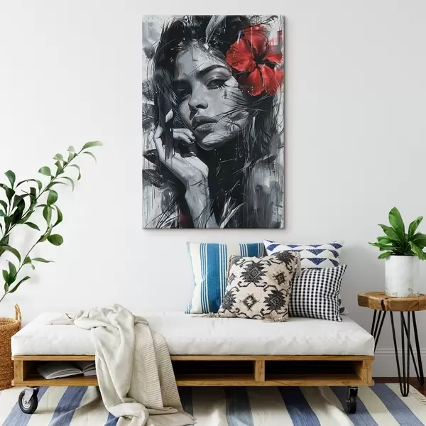 Paveikslas Juodai balta mergaitė su raudona gėle plaukuose Nr s41414