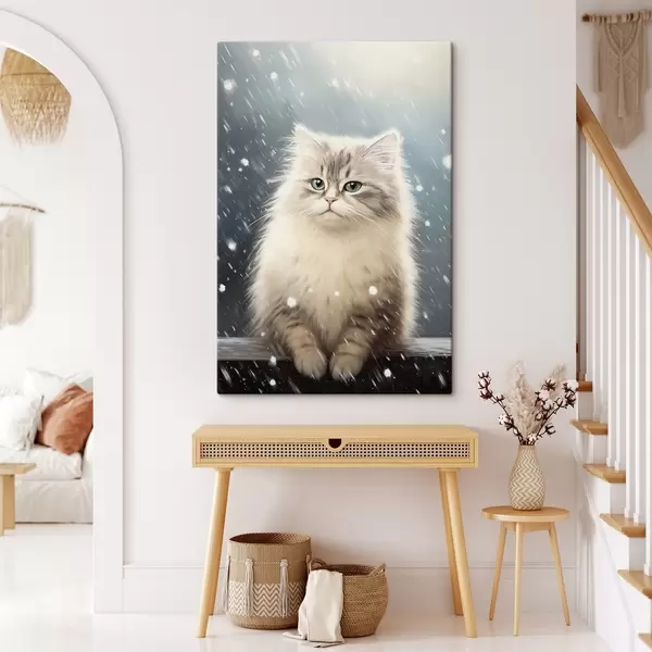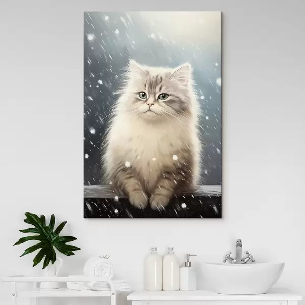 Paveikslas Pūkuotas kačiukas sėdi po krentančiu sniegu Nr s41440