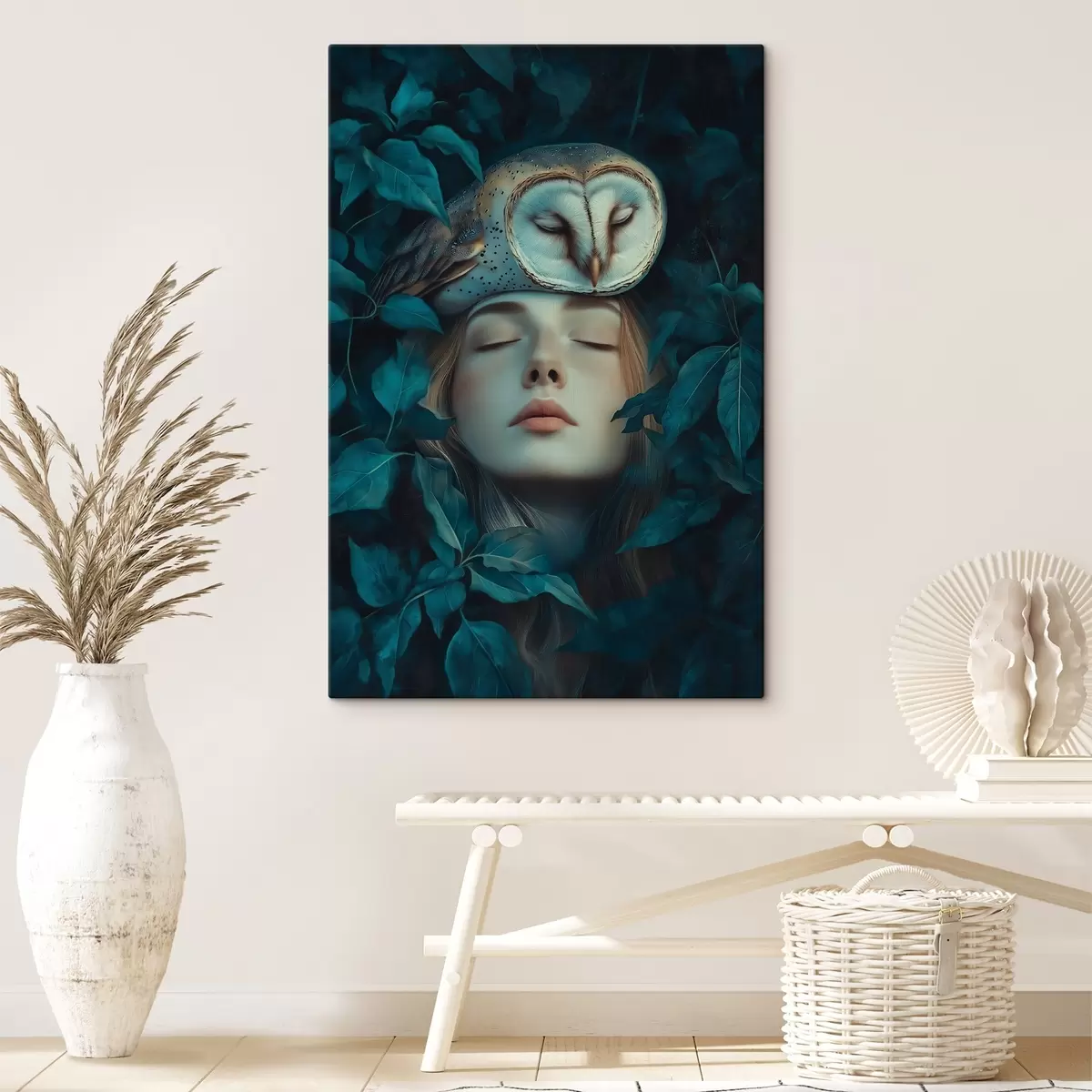 Paveikslas Moteris su pelėda žaliuose lapuose, ramus, gamta Nr s41445