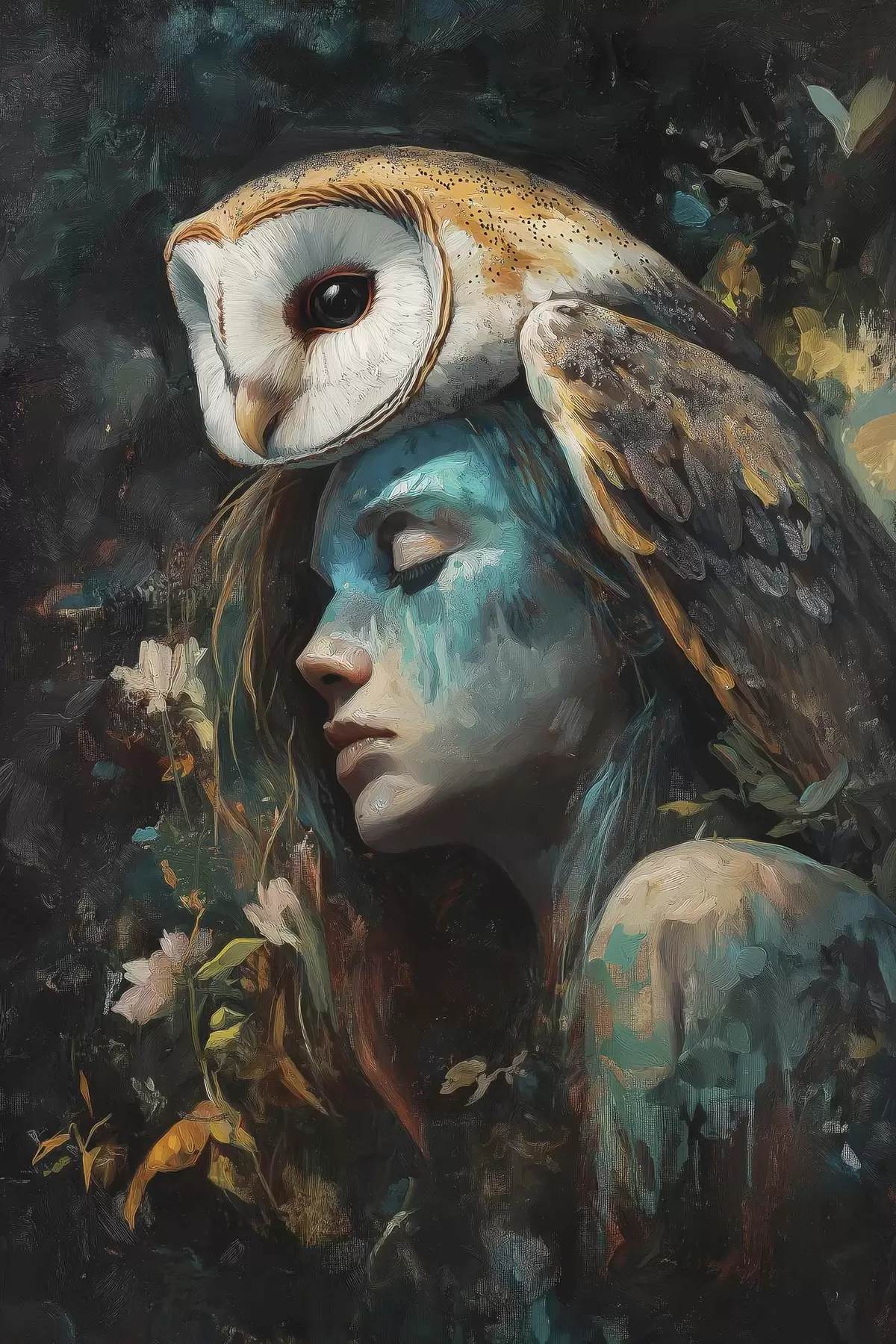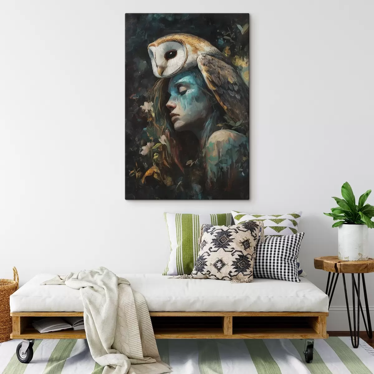 Paveikslas Aliejinis piešinys, graži pelėda su jauna moterimi, gėlių Nr s41446