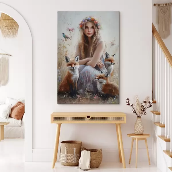 Paveikslas Mergaitė pievoje, laukiniai gyvūnai, lapės, paukščiai, gėlių vainikas Nr s41451