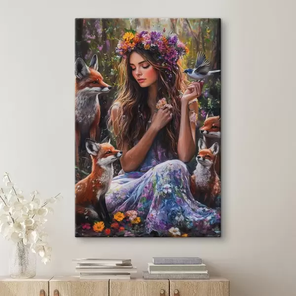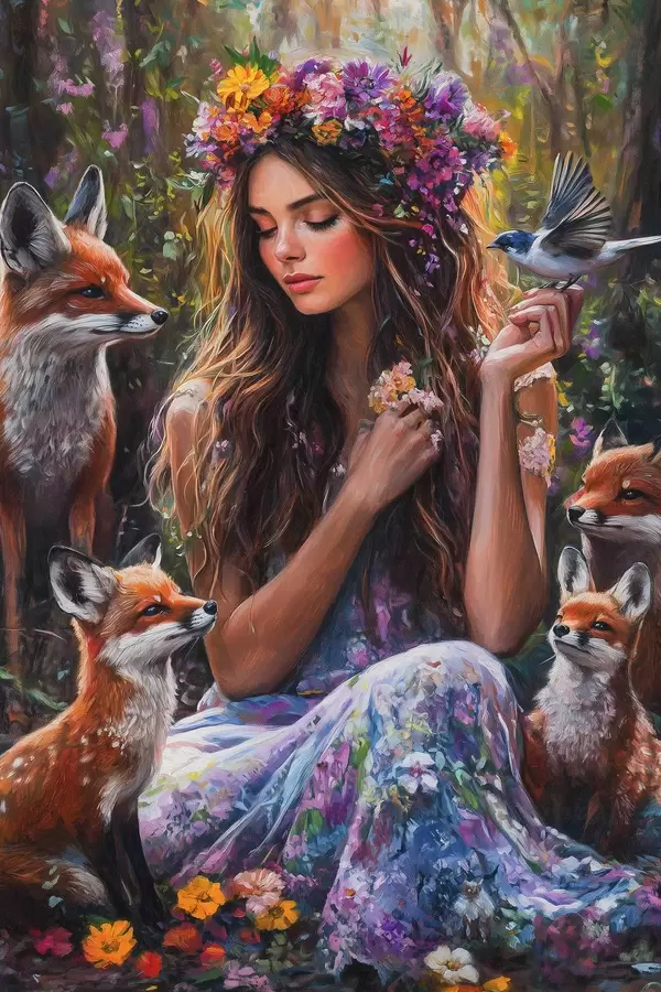 Paveikslas Graži mergaitė su laukiniais gyvūnais, pieva, gėlės, lapės, paukščiai, piešinys aliejumi Nr s41453