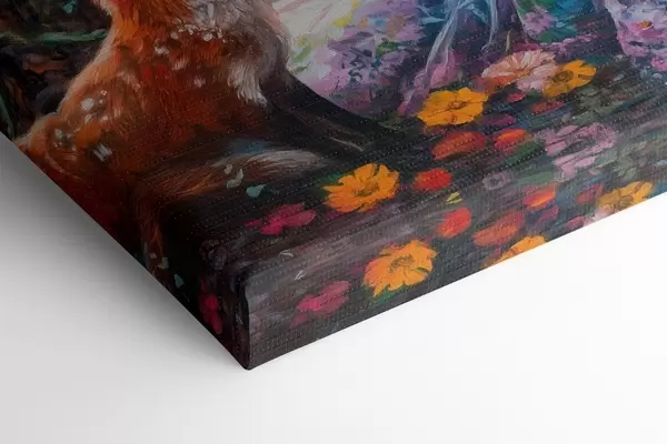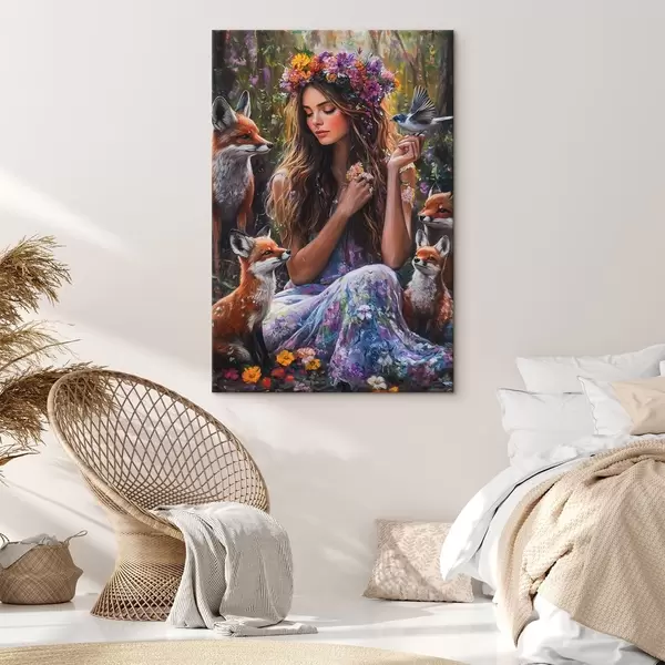 Paveikslas Graži mergaitė su laukiniais gyvūnais, pieva, gėlės, lapės, paukščiai, piešinys aliejumi Nr s41453