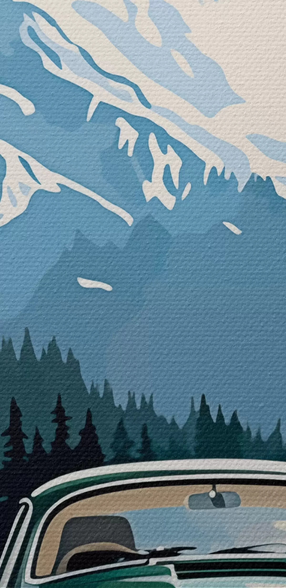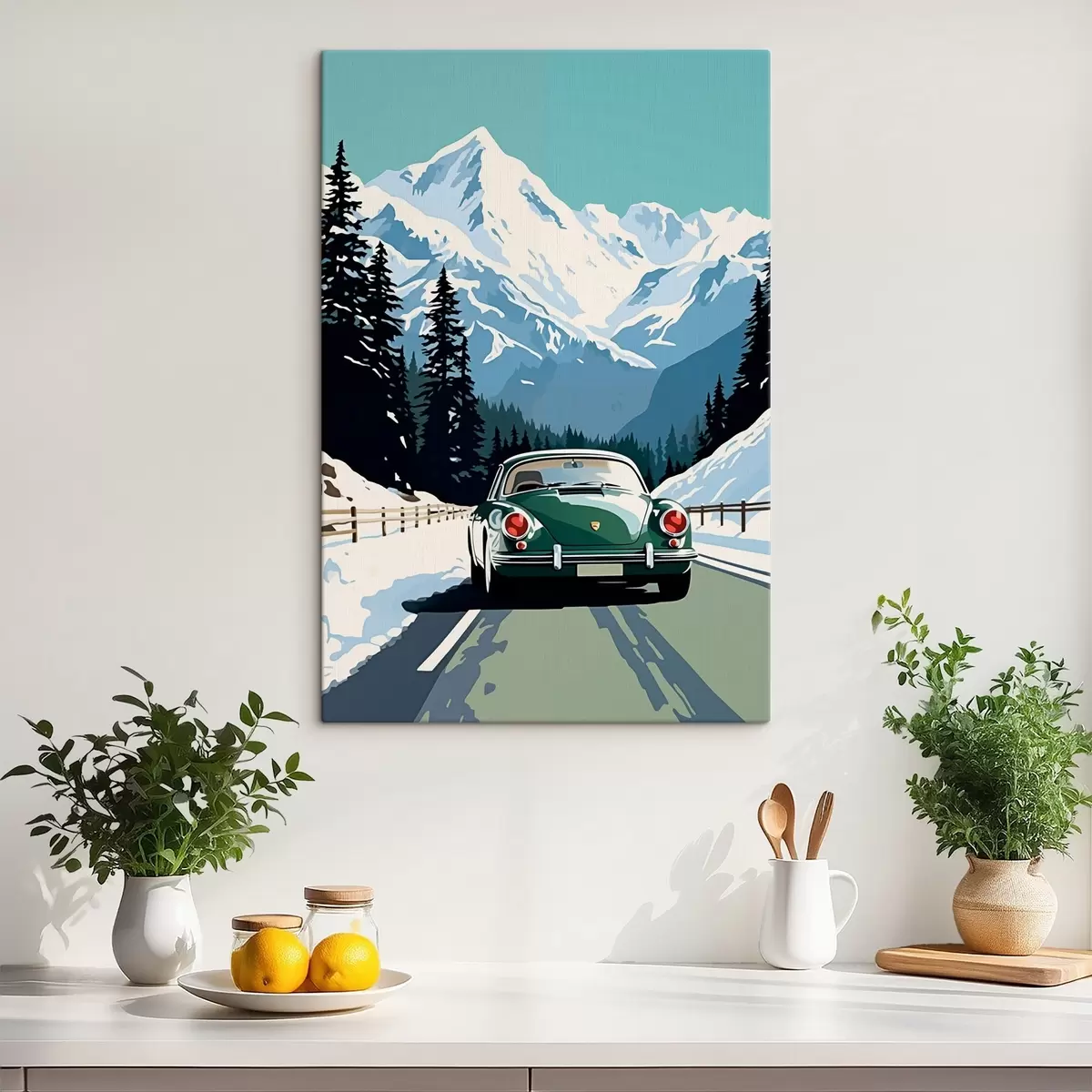 Paveikslas Retro automobilis žiemos kalnų kelyje Nr s41478