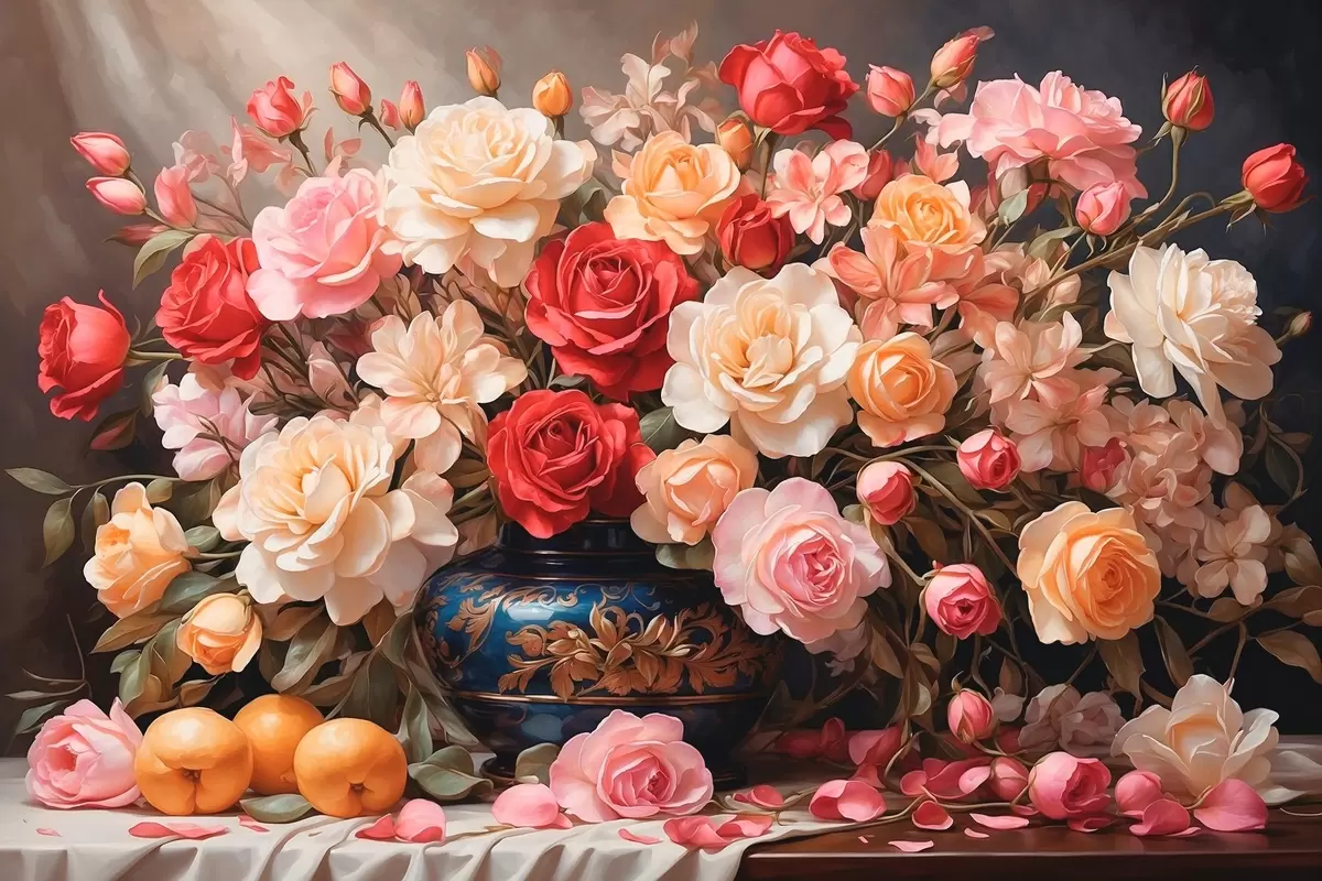 Paveikslas Gėlių puokštė mėlynoje tūrinėje vazoje Nr s41518